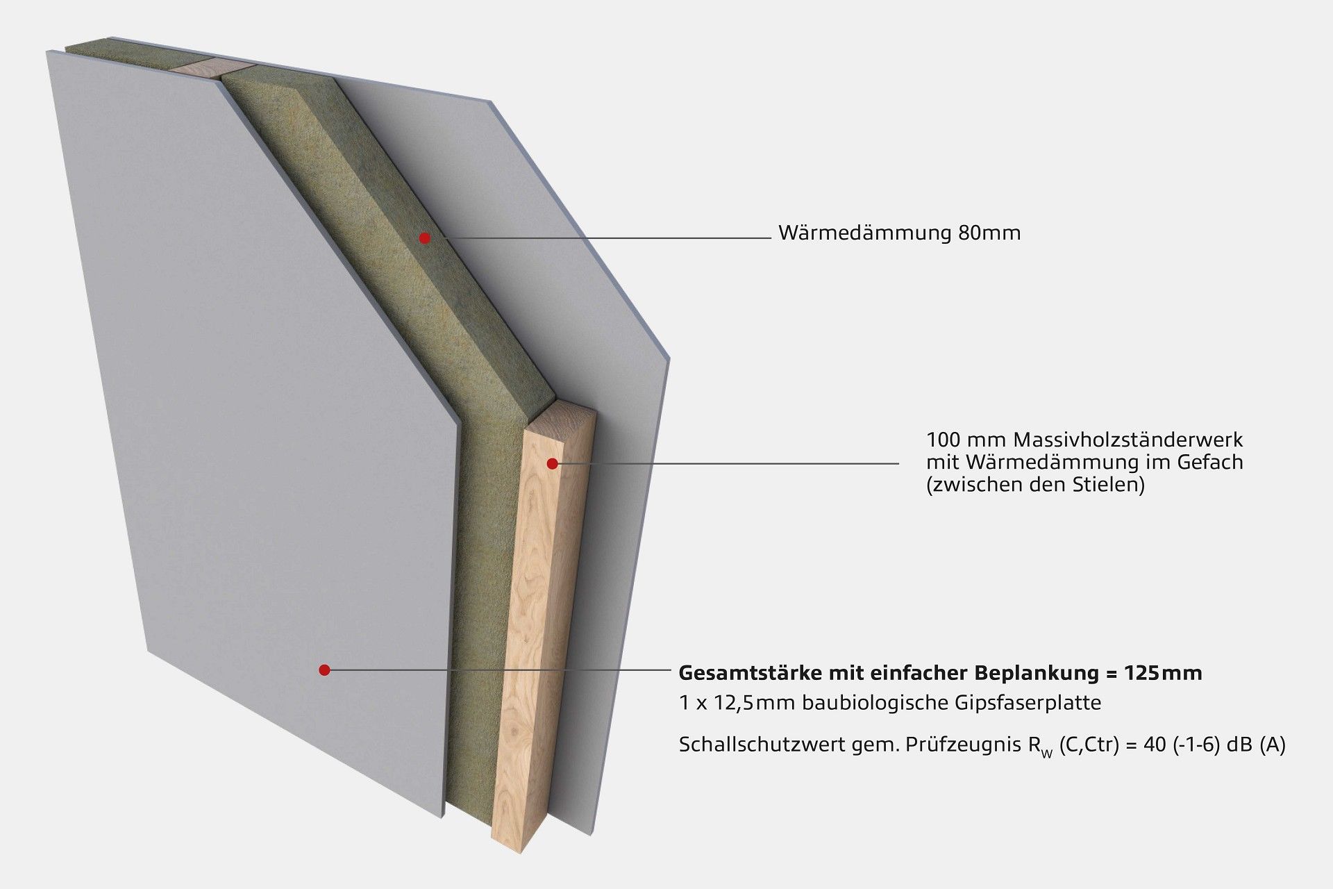 Die Wandstärke der Innenwände beträgt 125 mm, die der Installationswände 225 mm. Der Wandkern besteht aus einer massiven Holzständerwerk-Konstruktion, die mit einer mineralischen Dämmung voll ausgefacht ist.