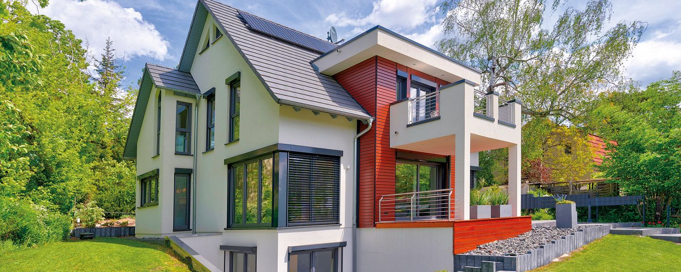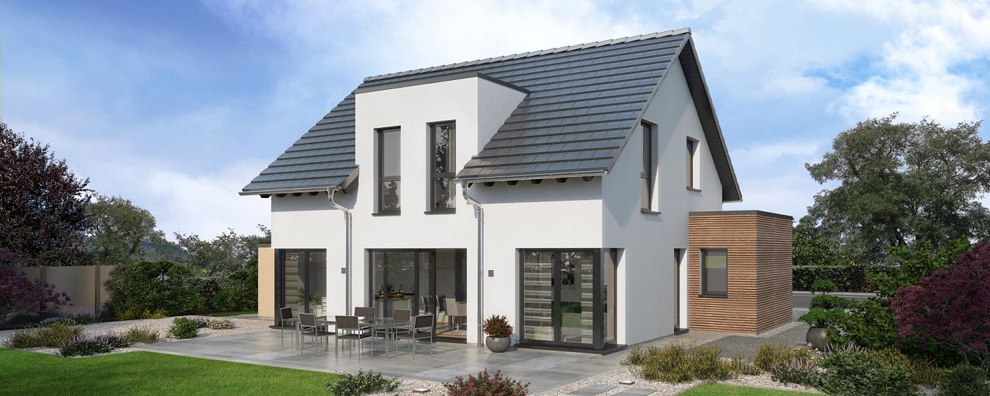 Die wesentlichen Gestaltungselemente, die die Architektur Ihres zukünftigen Zuhauses ausmachen, sind die Dachform, die Größe und Anordnung der Fenster und Terrassentüren, eventuelle Anbauteile, wie eine Haustür- oder Terrassenüberdachung, Gauben, Erker oder Balkone. Gemeinsam mit der Fassadengestaltung und der Haustür verleihen sie Ihrem Haus Individualität und strahlen die Einzigartigkeit aus, die Sie sich wünschen.