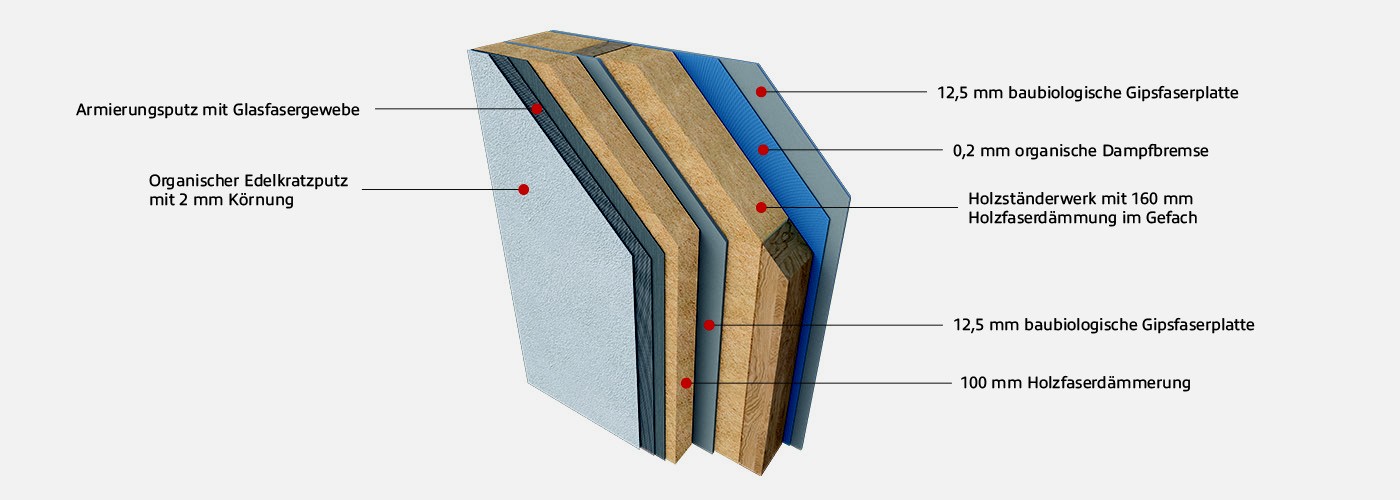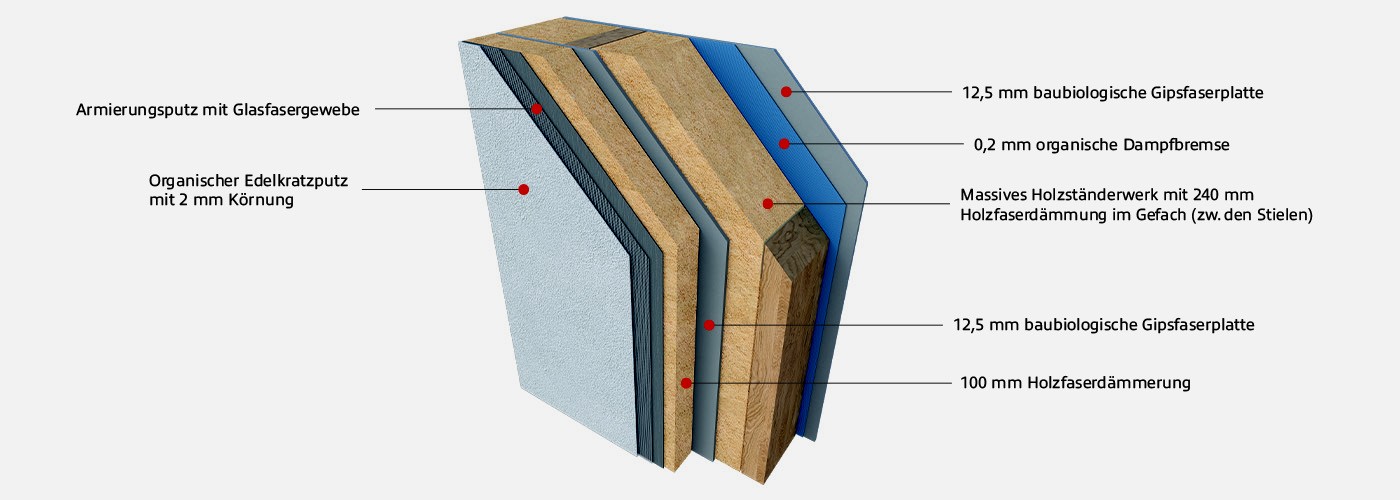Zum Einsatz kommen der bewährte, hoch wasserdampfdurchlässige Sto-Außenputz, darunter für das Wärmedämm-Verbundsystem die StoThermWood Holzfaserdämmplatte und im Gefach die GUTEX Thermoflex(flexible Holzfaserdämmplatte). In Kombination mit der organischen Dampfbremse ergibt sich ein optimales Feuchtverhalten der Konstruktion.