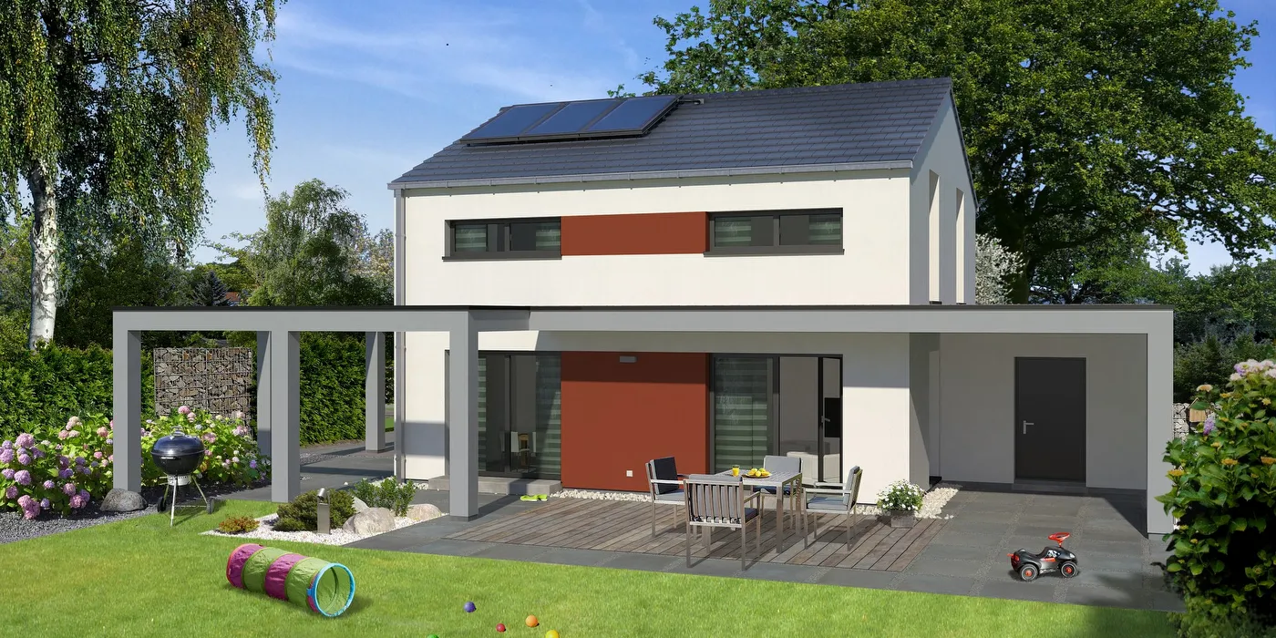 Das moderne Energiespar-Haus ist in der Architektur geprägt von einem überdachten Hauseingangsbereich, der sich fließend fortsetzt und sich mit der Garage zu einem Gestaltungselement verbindet. Eine überdachte Terrasse und eine weiterführende Gestaltung mit Luftbalken gestalten und prägen die Gartenseite des Hauses. Im Erdgeschoss ist ein großer Wohn-/Essbereich mit einer offenen Küchengestaltung geplant.