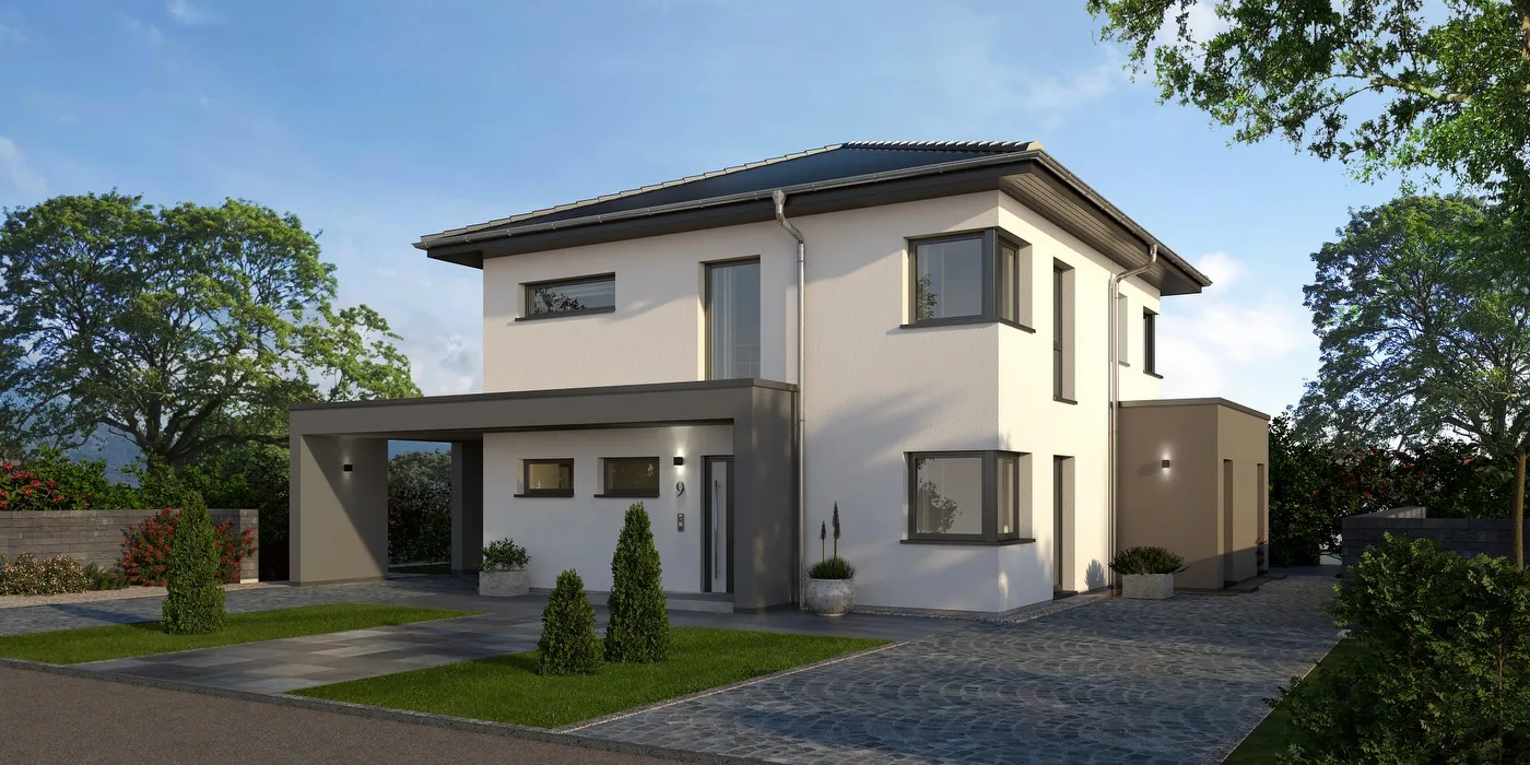 Das moderne Stadthaus wird durch einen Übereck-Erker und einen überdachten Hauseingang mit angeschlossenem Carport sowie Übereck-Fenstern akzentuiert. Das repräsentative Haus bietet auf einer Grundfläche von 158 m², neben dem offen gestalteten Wohnbereich, Platz für 4 Schlafräume und 2 Bäder. Im Erdgeschoss ist die Grundrissgestaltung mit einem großzügigen Wohn-/Ess- und Kochbereich angelegt.