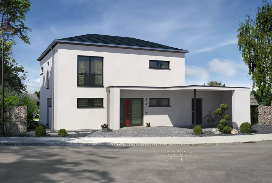 Die Architektur des modernen Stadthauses überzeugt mit vielen Details. Großzügig geschnittene Räume, eine innovative Haustechnik und eine elegante, großzügige Dachterrasse sind die Highlights dieses Architektenhauses. Der überdachte Hauseingang geht fließend in ein Carport über. Vom Carport aus gelangt man mit den Einkäufen über einen Nebeneingang in den Haustechnik- und Vorratsraum.