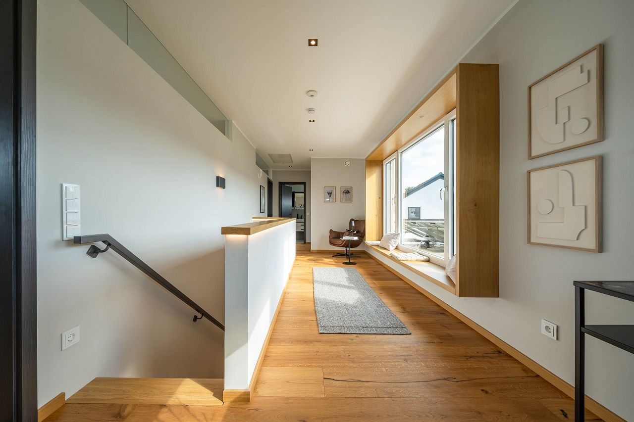 Die geräumige Diele bietet mit 12,5 m² viel Platz für eine Garderobe und empfängt die Hausbesitzer und Gäste gleichermaßen freundlich. Im Erdgeschoss, des früheren Bungalows, ist weiterhin auf 62 m² sehr großzügig der Wohn-/Ess- und Kochbereich angelegt. Der Dielenfußboden in Wildeiche und eine helle, freundliche Wandgestaltung sowie Mobiliar mit Holz und schwarzen Akzenten sind charakteristisch für den Modern Country Style. Im Wohnbereich und im Wohnflur im Obergeschoss ist jeweils ein Panoramafenster als Sitzfenster mit einem schicken Holzrahmen eingefasst, so sind herrliche Lieblingsplätze zum Lesen und Entspannen entstanden.