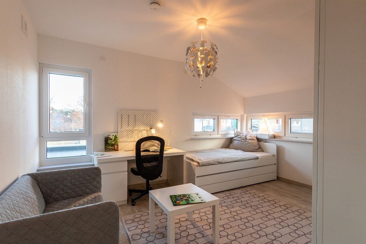 Ein erhöhter Kniestock im Dachgeschoss sorgt für Modernität und bietet außerdem eine bessere Raumnutzung und mehr Stellfläche. Im Dachgeschoss des modernen Energiesparhauses befinden sich zwei gleich große Kinderzimmer, ein Kinderduschbad und ein Elternbereich mit separater Ankleide sowie Bad en suite.