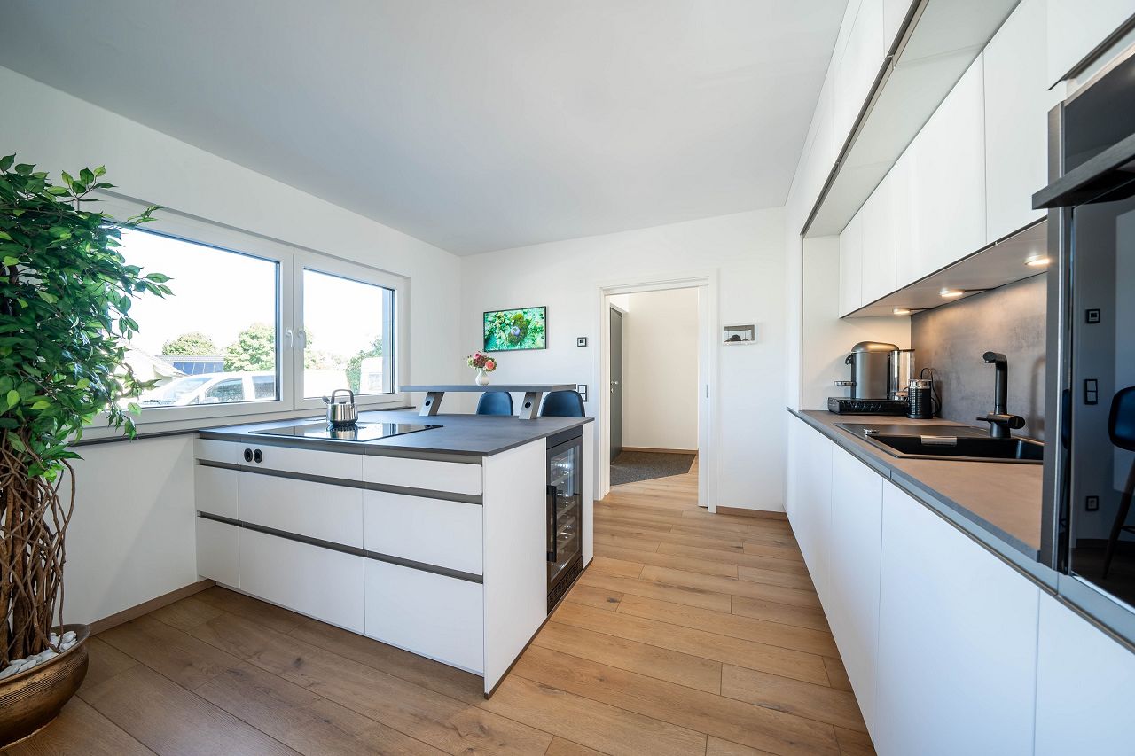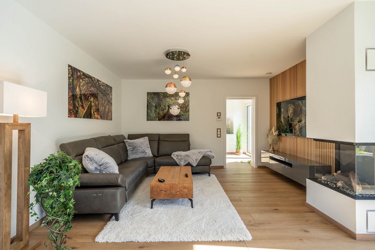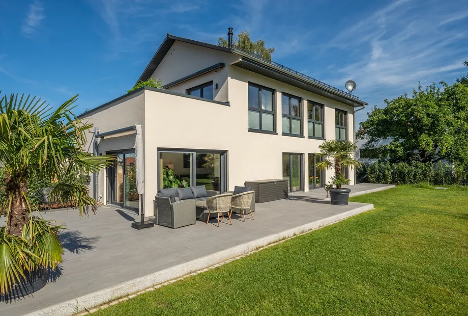 Highlights: Zwei Erker, Panorama-Hebeschiebetüren, Wellnessbad, Hobby- und Arbeitszimmer, Dachterrasse, Holzlisenen, Gaskamin