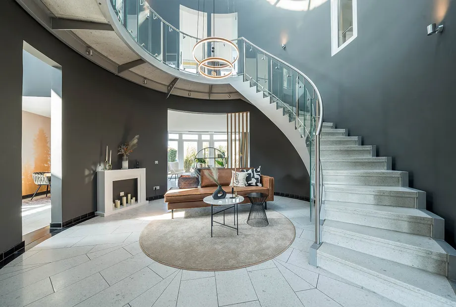 Das STREIF-Musterhaus steht in der FertighausWelt Hannover, wo es ein absoluter Hingucker ist. Auch gilt es als eins der kreativsten Projekte im deutschen Fertighaus-Markt, denn das Haus zeichnet sich durch eine außergewöhnliche Architektur aus. Im Erdgeschoss gewährt der Eingang einen Blick ins Atrium und vermittelt Größe und Stil. Die Rundwände des Atriums trennen den 45 m² großen, geräumigen Wohntrakt und den Koch- und Essbereich voneinander, gleichzeitig wird der Wohntrakt dadurch eingebunden.