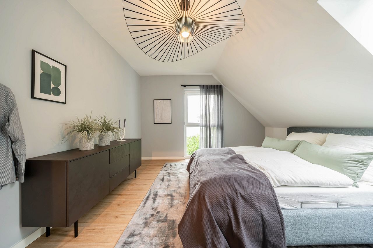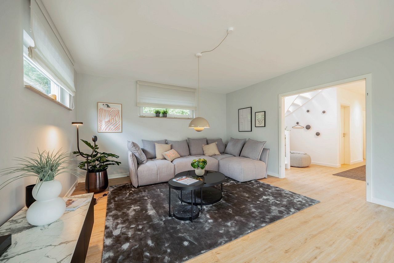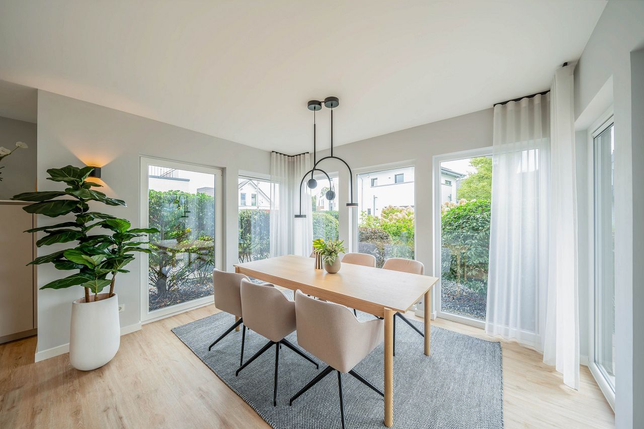 Das Musterhaus in Hannover wurde stilvoll ausgestattet und möbliert. Zarte Farben in hellen Naturtönen und helle Möbel bringen Leichtigkeit ins Wohnen. Ein strapazierfähiger Fußbodenbelag in Holzoptik sorgt für Behaglichkeit. Weiße Fensterrahmen und Zimmertüren unterstreichen das stilvolle Ambiente.