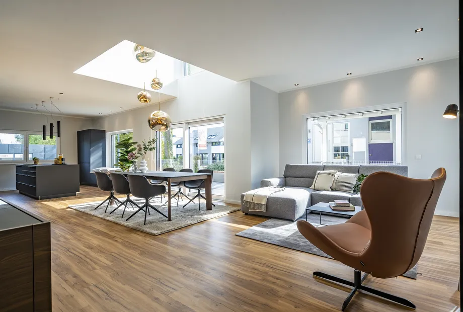 Der Wohn-/Ess-/Kochbereich ist auf 59 m² großzügig angeordnet. Die Highlights im Erdgeschoss sind eine schöne Galerie, ein großes Panorama-Sitzfenster, Panorama-Hebeschiebetüren und eine Komfortraumhöhe. Diese Details sorgen für eine besondere Atmosphäre und viel Großzügigkeit. Eine Stahlwangentreppe mit Stufen in Wildeiche und einem Ganzglasgeländer setzen den Eingangsbereich mit Diele und separater Garderoben in Szene und sorgen gemeinsam für einen behaglichen Empfang im Haus.