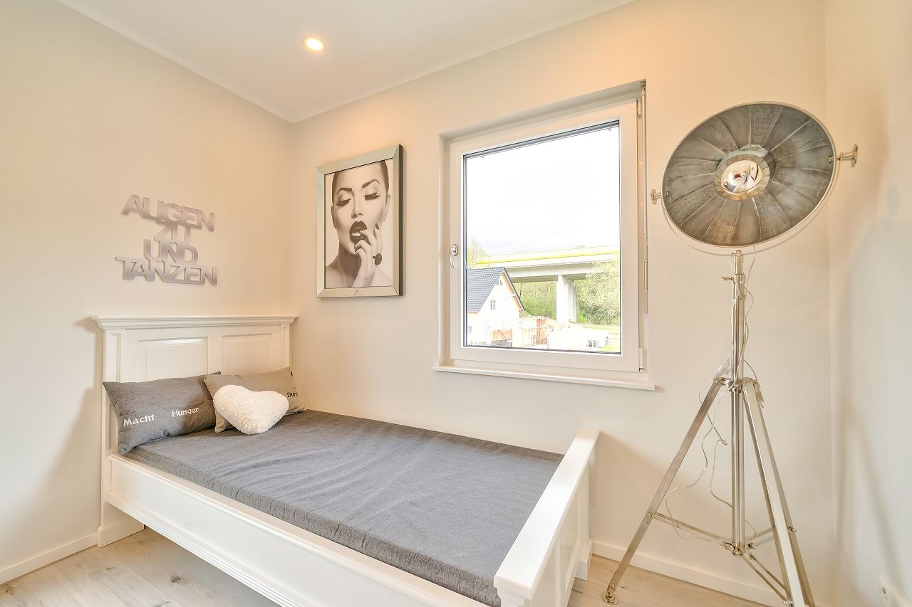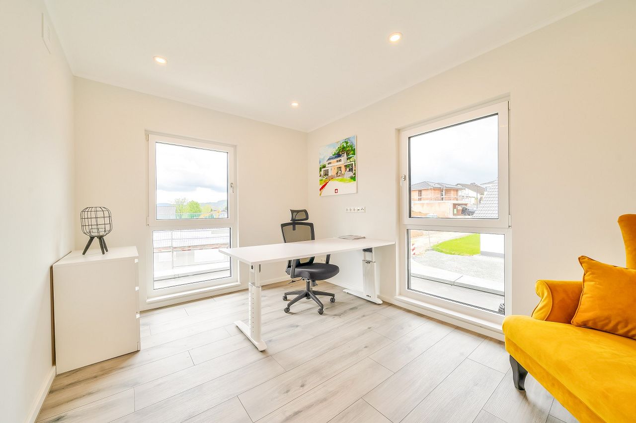 Das neue Musterhaus in Meschede ist mit einem Übereckerker und einem schicken Haustürvordach realisiert. 3 Schlafzimmer, 3 Bäder und ein Zusatzraum (Homeoffice, Hobby, Gäste) bieten einen hohen Wohnkomfort. Es erwartet Sie ein Energieeffizienzhaus 40, das kaum Wünsche offen lässt.