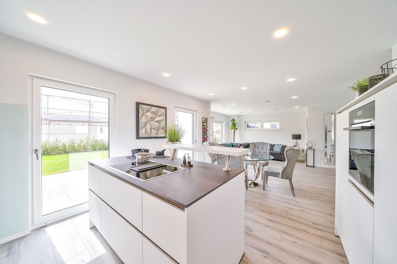 Das Herzstück im Erdgeschoss ist ein 43 m²-großer Wohn-/Essbereich mit offen gestalteter Küche. Vier Terrassentüren und eine Panorama-Hebe-Schiebetür sorgen dafür, dass der gesamte Wohnbereich hell und lichtdurchflutet ist. Ein praktischer Hauswirtschafts-/Haustechnikraum schließt sich direkt an die Küche an. Ein zusätzliches Zimmer, das als Arbeits-/Schlaf- oder Gästezimmer genutzt werden kann, macht in Kombination mit einem zweiten Bad das Erdgeschoss zu einer separat nutzbaren Etage. So haben die Bauherren zum Beispiel für das Wohnen im Alter auf einer Etage bereits bestens vorgesorgt. Der Eingangsbereich und die Diele bilden einen repräsentativen und großzügigen Blickfang. Im Obergeschoss der Stadtvilla befindet sich der Elternschlafbereich mit separater Ankleide und einem Wellnessbad en Suite. Zwei Kinderzimmer und ein Kinderbad sorgen für Komfort und komplettieren das großzügige Raumangebot.