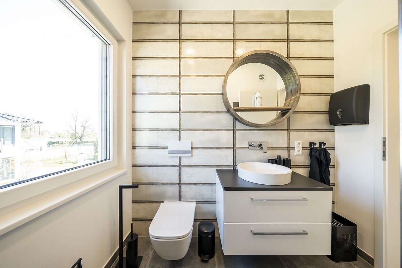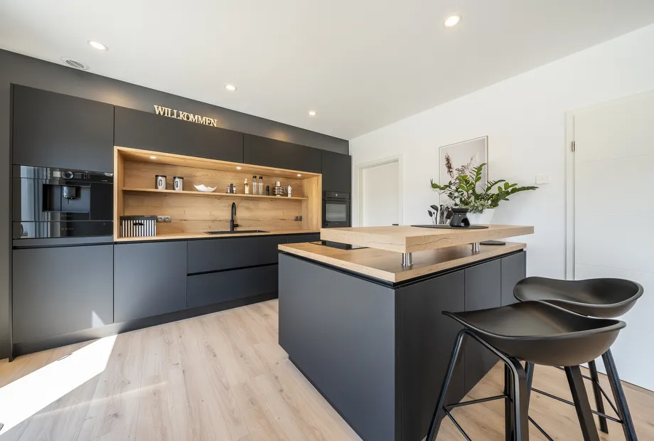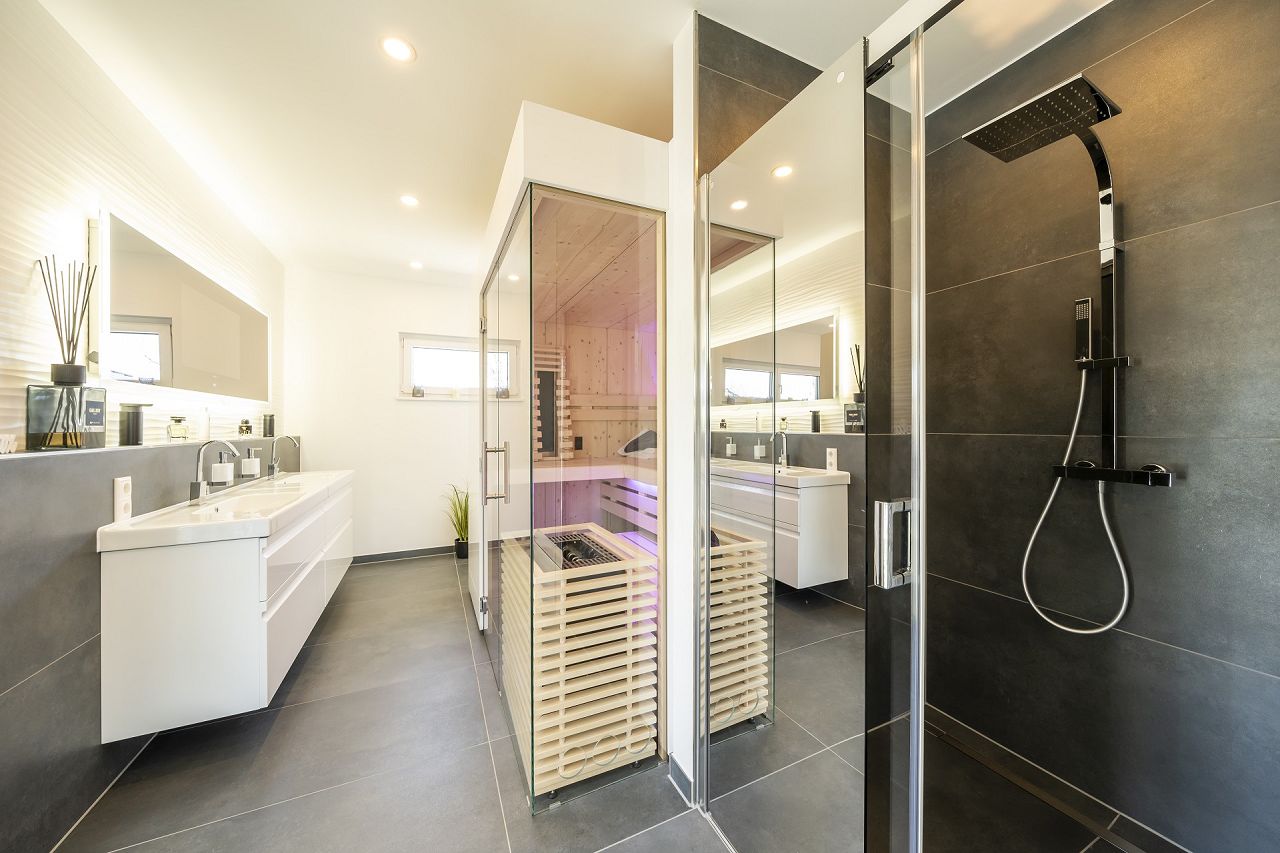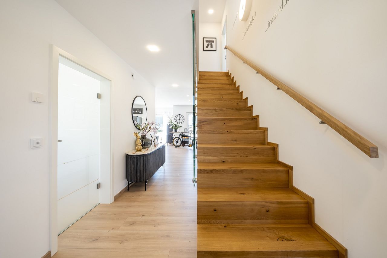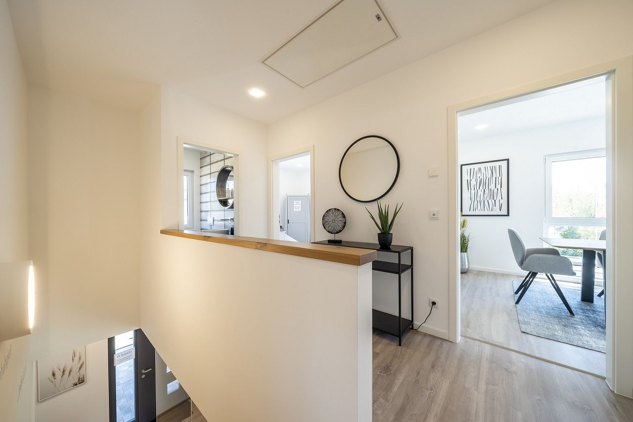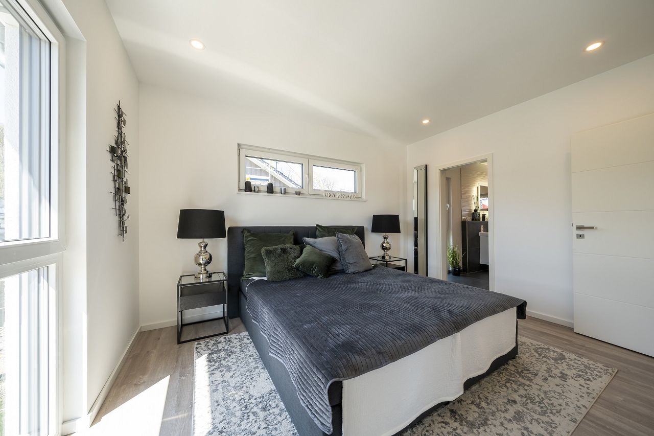 Für ein perfektes Raumklima sorgt eine Luft-Wasser-Wärmepumpe mit Fußenbodenheizung. Eine kontrollierte Be- und Entlüftung mit Wärmerückgewinnung ist im Gerät integriert. Mit einer Smar-tHome-Funktion ist die Beschattung des Hauses zusätzlich auch vom Handy aus regelbar. Das neue Musterhaus von STREIF erfüllt bereits viele Wohnwünsche und Anforderungen. Dennoch wird jedes STREIF-Haus individuell geplant und gebaut als KfW-Energieeffizienzhaus 40 im Standard.