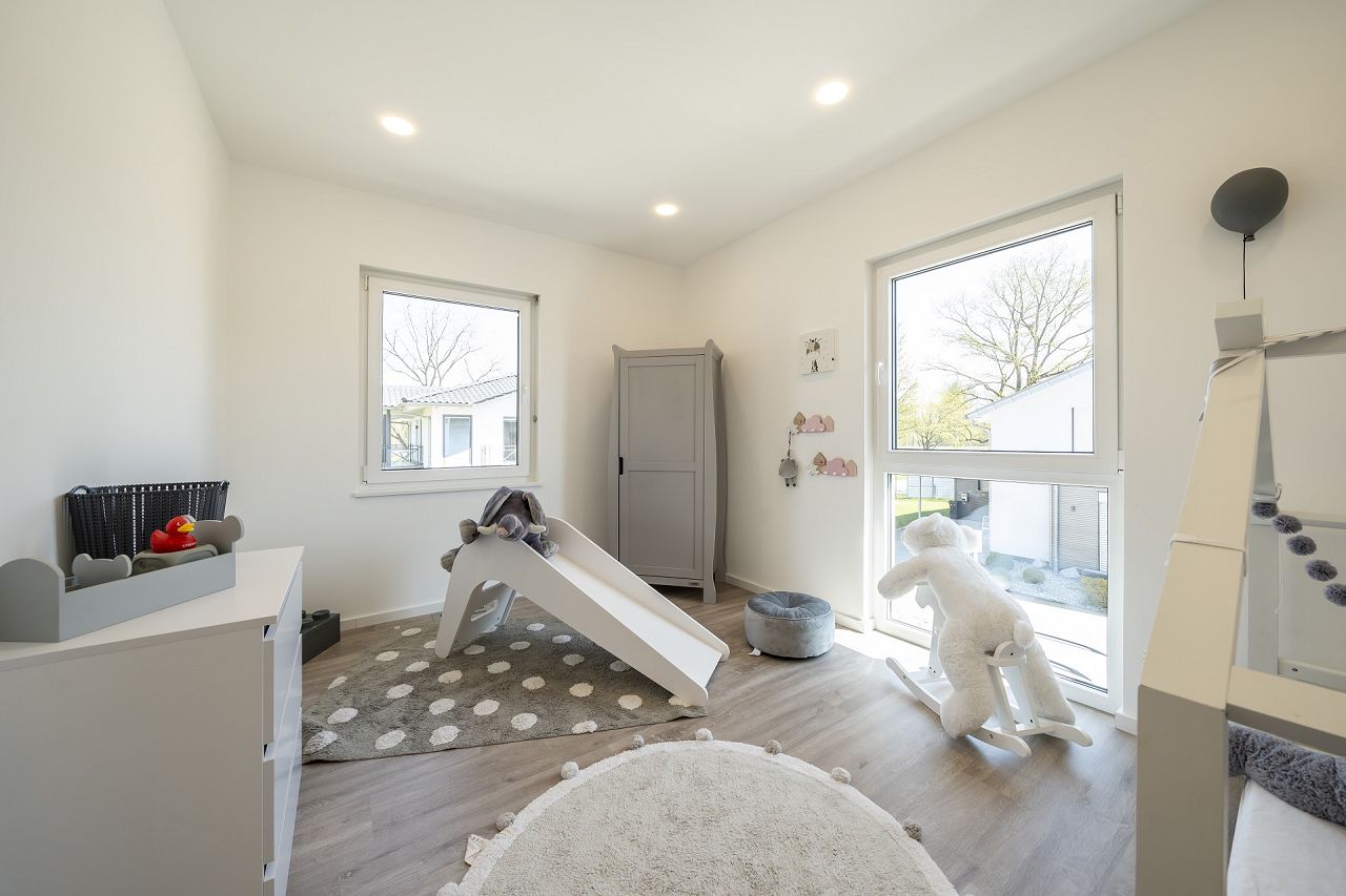 Die Grundrissgestaltung ist auf 151 m² Netto-Raumfläche klug angelegt. Der Wohn-/Ess- und Kochbereich ist in einem Übereckerker auf großzügigen 43 m² geplant. Der Bereich wird von einer Panorama-Hebeschiebetür, 2 Terrassentüren und einem Fenster lichterfüllt. Direkt neben der Küche befindet sich der praktische Hauswirtschafts/Haustechnikraum. Im Erdgeschoss ist ein zusätzlicher Raum angelegt, der flexibel als Homeoffice, Gäste-/Hobbyzimmer oder Schlafzimmer genutzt werden kann. Im Erdgeschoss ist ein Duschbad angelegt, somit ist auch für die Zukunft gut vorgesorgt. Bei Bedarf ist das Wohnen auch auf einer Etage möglich. Der Elternbereich im Obergeschoss ist als Rückzugsort mit einem eigenen Ankleidebereich und einem großen Bad mit direktem Zugang geplant. Ein zweites Duschbad für die Kinder bietet weiteren Komfort.