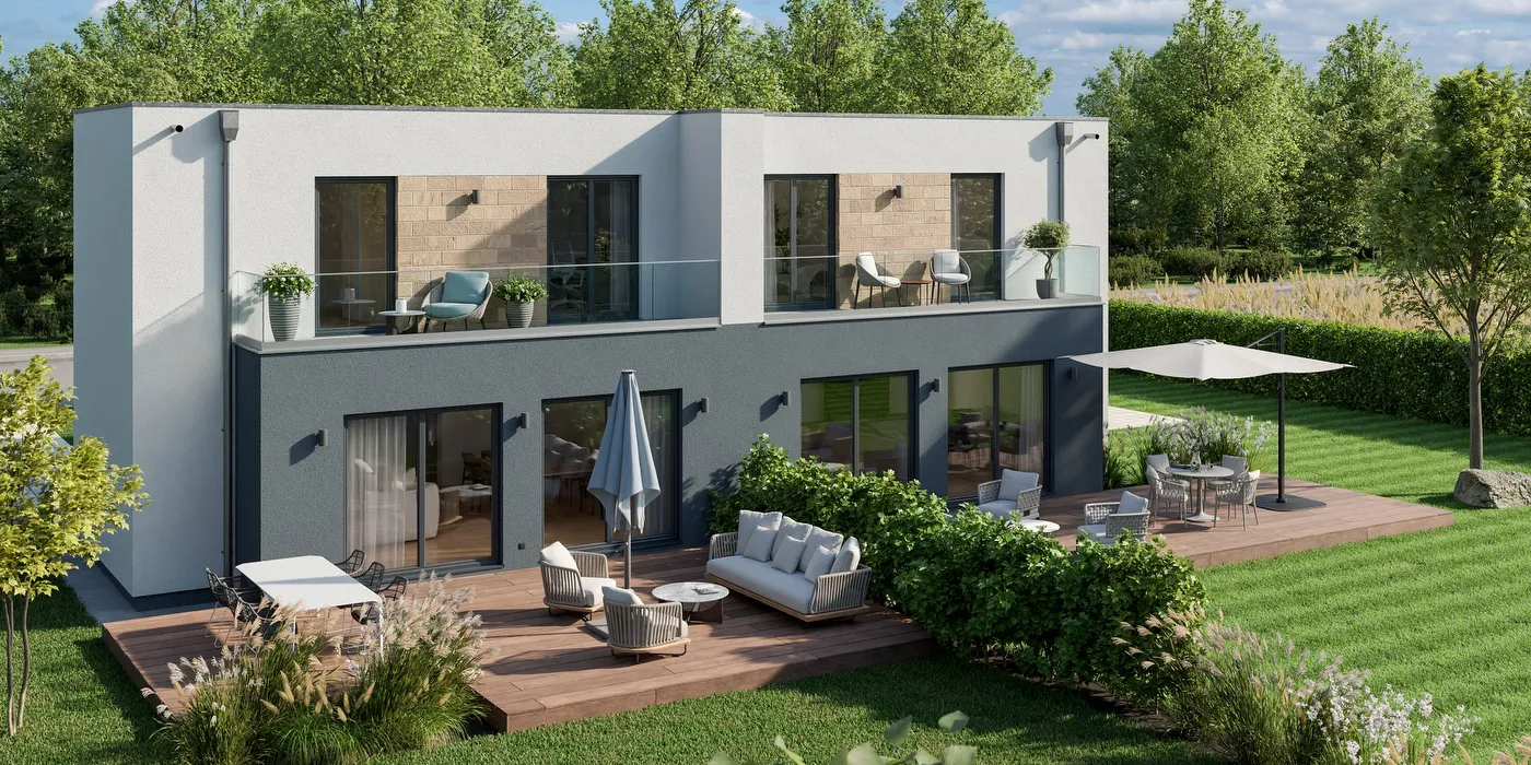 Dieser Doppelhausentwurf bringt Understatement in der Architektur mit sich. Gebäudeversätze an der Frontseite und seitlich vergrößern die Räume und sorgen für das besondere Etwas. Gegen Aufpreis sorgen eine zweifarbige Fassadengestaltung oder eine Natursteinverkleidung für noch mehr Individualität.