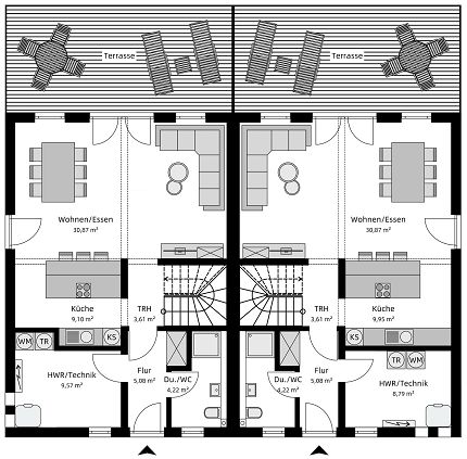 Jede Haushälfte verfügt über einen eigenen Haustechnikraum mit Hauswirtschaftszonen und Versorgungseinheiten. Die Systeme (z. B. Heizung, Lüftung, Wasser, Strom) sind technisch vollständig voneinander getrennt.