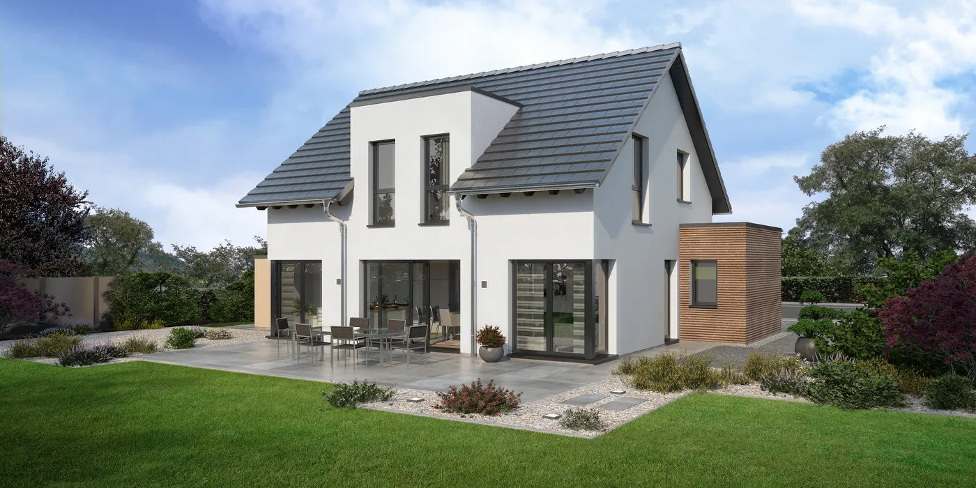 Das moderne Energiesparhaus punktet in der Architektur mit vielen Highlights. Die repräsentative Gartenansicht des Hauses ist mit einem Zwerchgiebel, einer XXL-Panorama-Hebeschiebetüre und sechs Terrassentüren, die übereck angeordnet sind, geplant. Die Frontansicht wird gekennzeichnet von einer Wohnraumerweiterung mit umbautem Hauseingang. Die Hausplanung bietet einen praktischen Nebeneingang zur Garage.