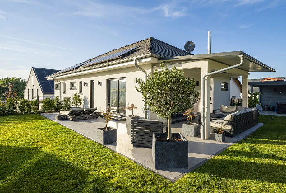 In der Grundrissgestaltung bietet der Bungalow mit 119,36 m² Netto-Raumfläche ein solides Raumangebot. Das Herzstück ist ein 50 m²-großer Wohn-/Ess- und Kochbereich, der in der Raumgestaltung kaum einen Wunsch offenlässt. Ein Schlafzimmer mit Ankleide, ein großes Bad, zwei Kinderzimmer und ein Gäste-WC vervollständigen das gewünschte Raumangebot.
