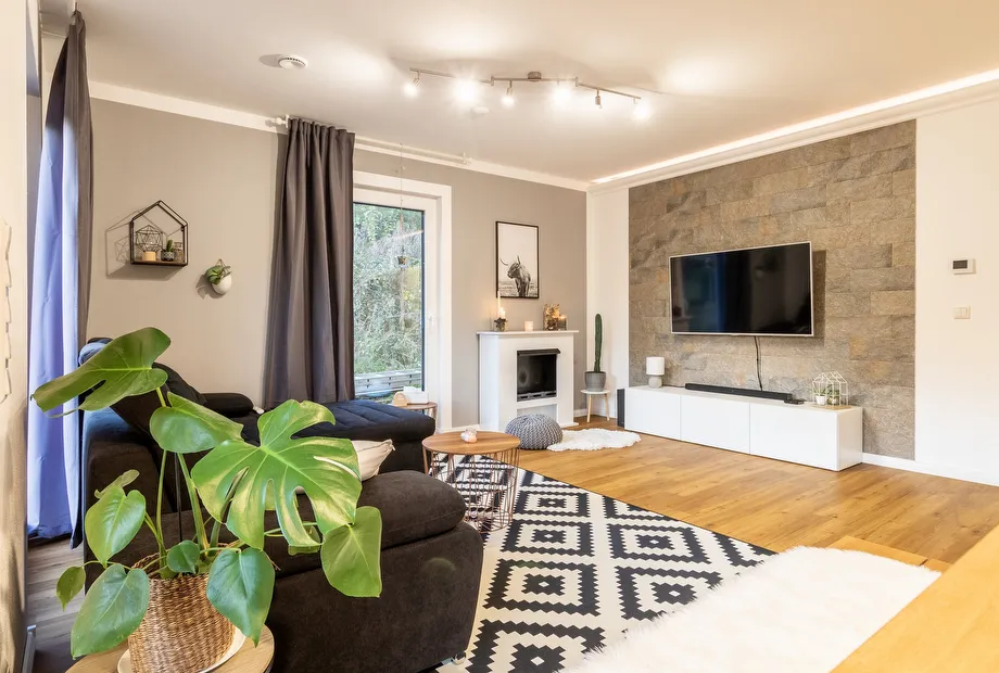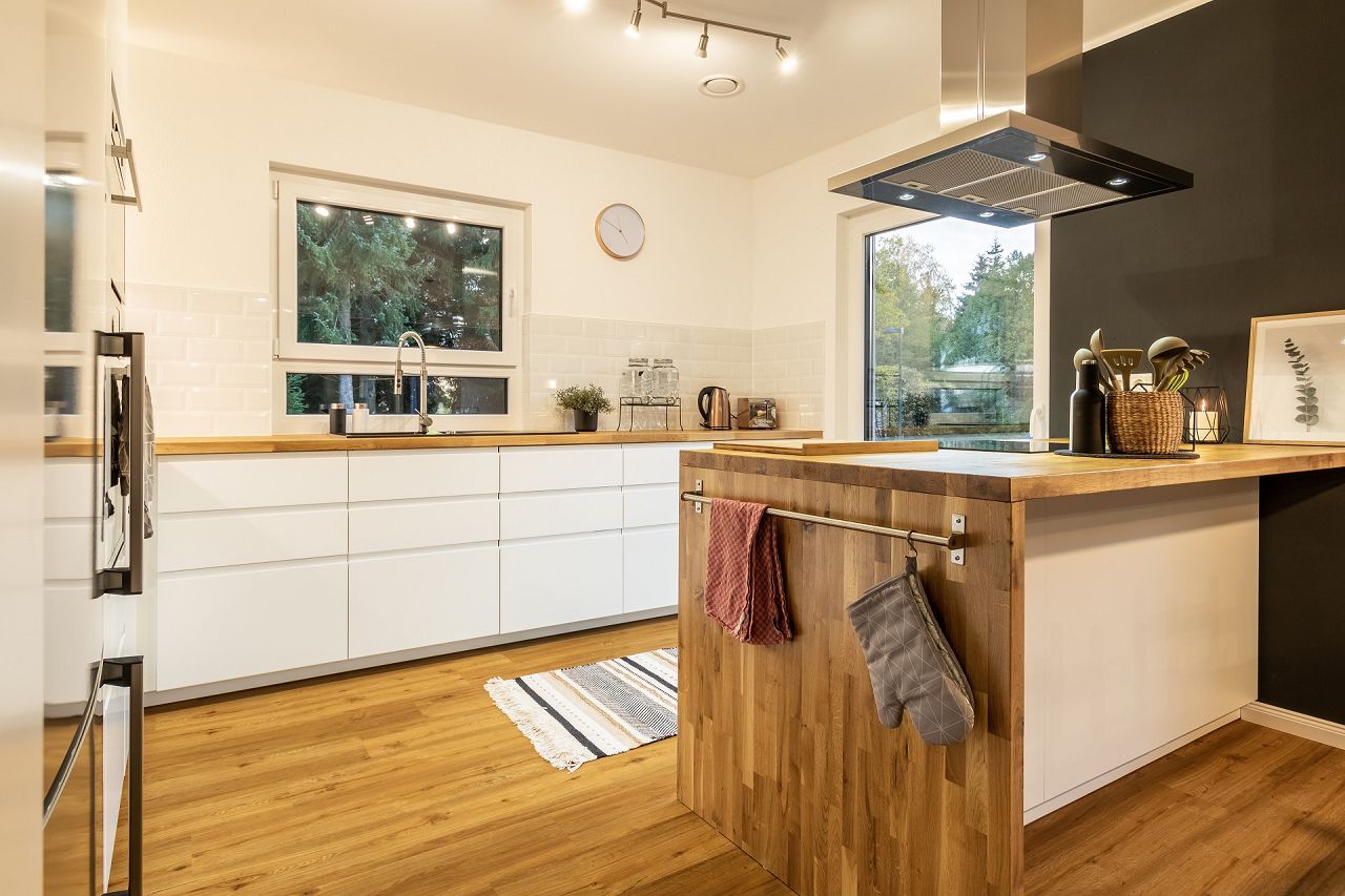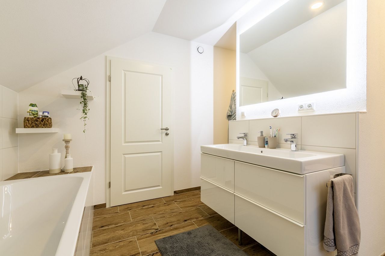 Das komplette Haus wurde vom Ehepaar im angesagten Scandi-Style ausgestattet und eingerichtet. Anregungen hat sich das Paar bei Pinterest und Instagram geholt. Mit sehr viel Geschick und Geschmack hat das Paar die eigenen vier Wände in ein hyggeliges Zuhause verwandelt. In der Farbwahl dominieren Weiß und Grau. Im Eingangsbereich wurde eine Sitzbank in einer Nische eingebaut und oberhalb mit Komodenknöpfen versehen, die als Kleiderhaken dienen. Eine Kaminkonsole, Teppiche und Möbel im Scandi-Style sowie unifarbene Gardinen machen das offene Wohn-/Esszimmer zum gemütlichen Lebensmittelpunkt. In der Küchenplanung wurde eine Küche in L-Form mit einer Kochtheke in klassischem Weiß mit einer Massivholzarbeitsplatte ausgewählt. Eine perfekte Ergänzung stellen die stylischen weißen Pariser-Metrofliesen dar. Auch das Schlafzimmer mit Ankleide wurde mit viel Detailliebe ausgestattet und in eine gemütliche Ruhezone verwandelt. Das Bad mit Bodenfliesen in Holzoptik, Badewanne, Waschtisch, WC und Dusche wird durch ein bodentiefes Fenster hell und Licht durchflutet. Durch die Bauweise mit einem erhöhten Kniestock, bieten die Räume im Dachgeschoss mehr Stellfläche und Platz.
