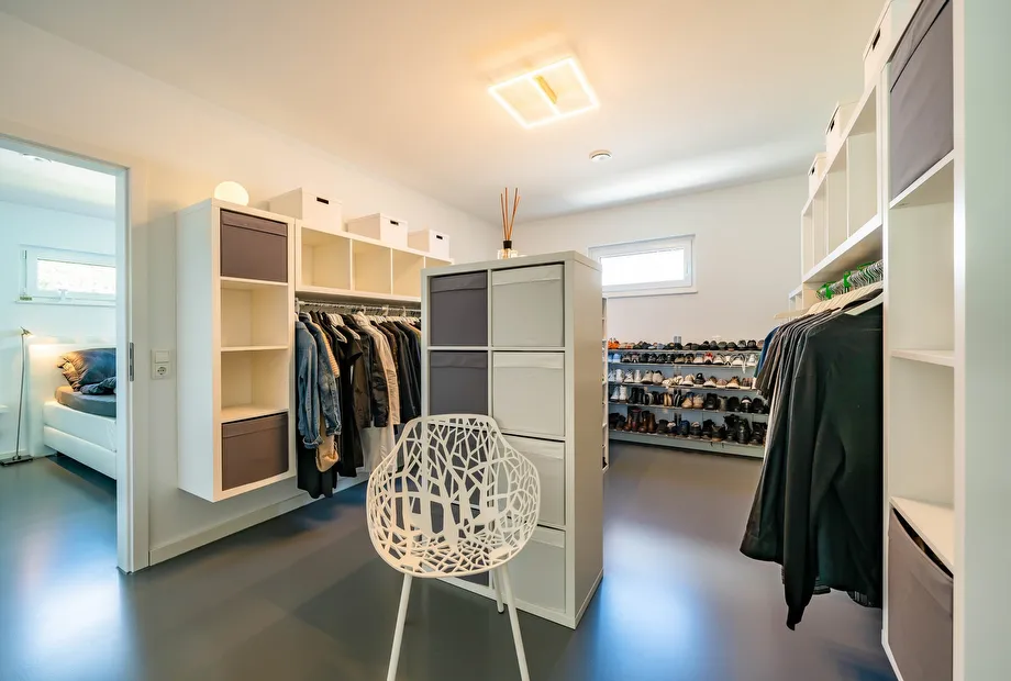 Der Schlafbereich ist so geplant, dass er über das Ankleidezimmer zu betreten ist. Liegende Fensterformate ermöglichen von außen keinen Einblick in den Schlafbereich. Mit 126,79 m² Netto-Raumfläche ist der Bauhaus-Bungalow perfekt für zwei bis drei Personen geplant.