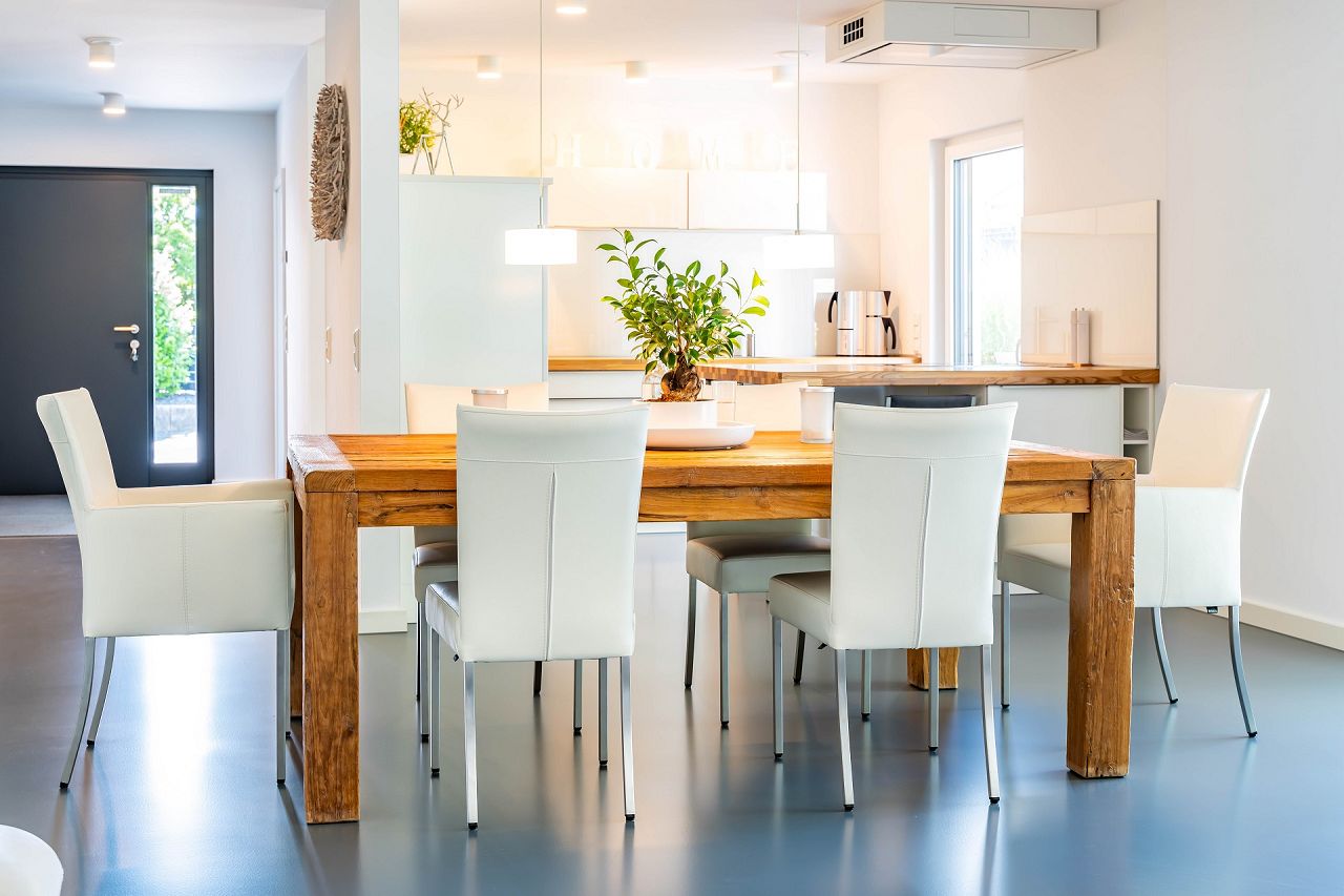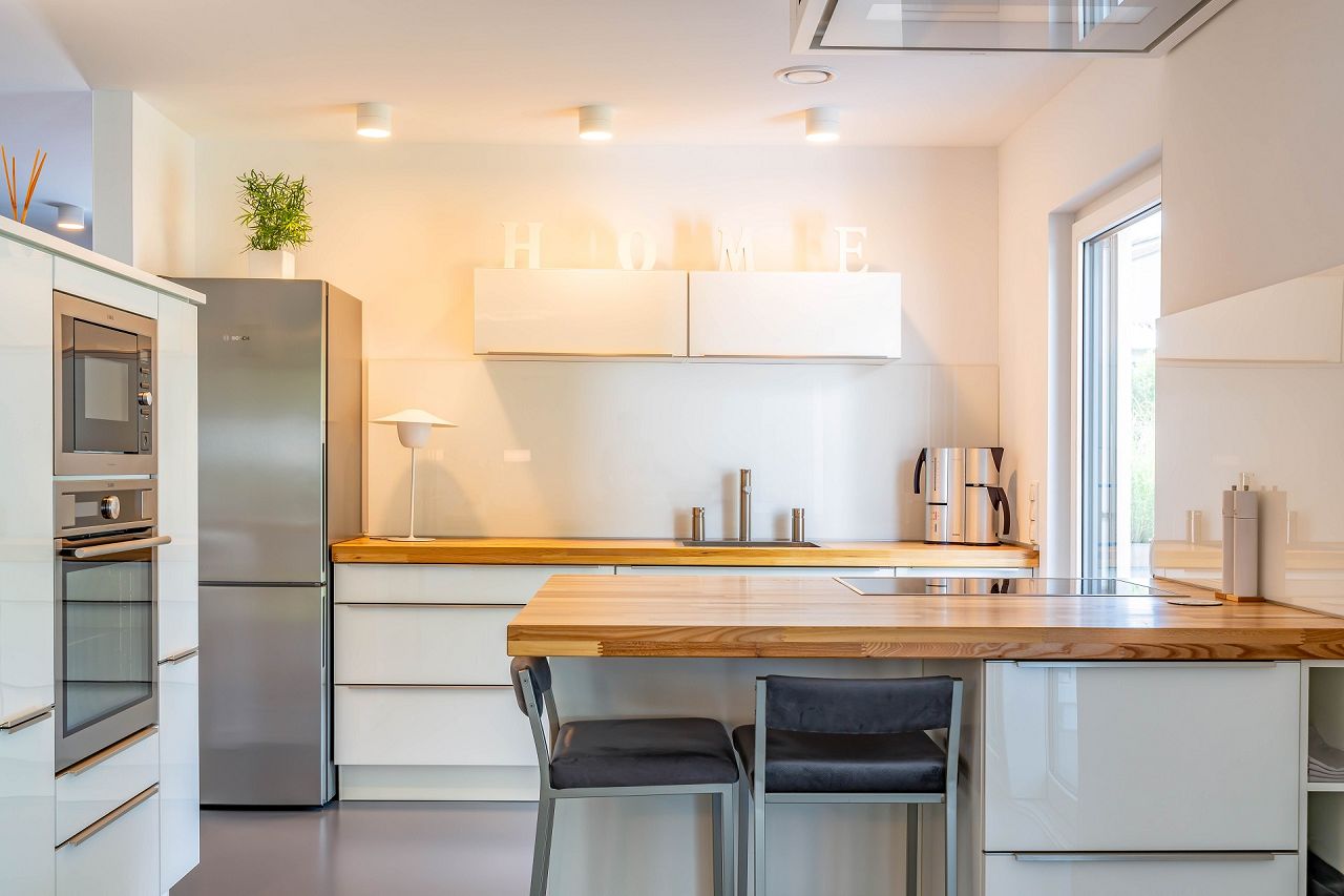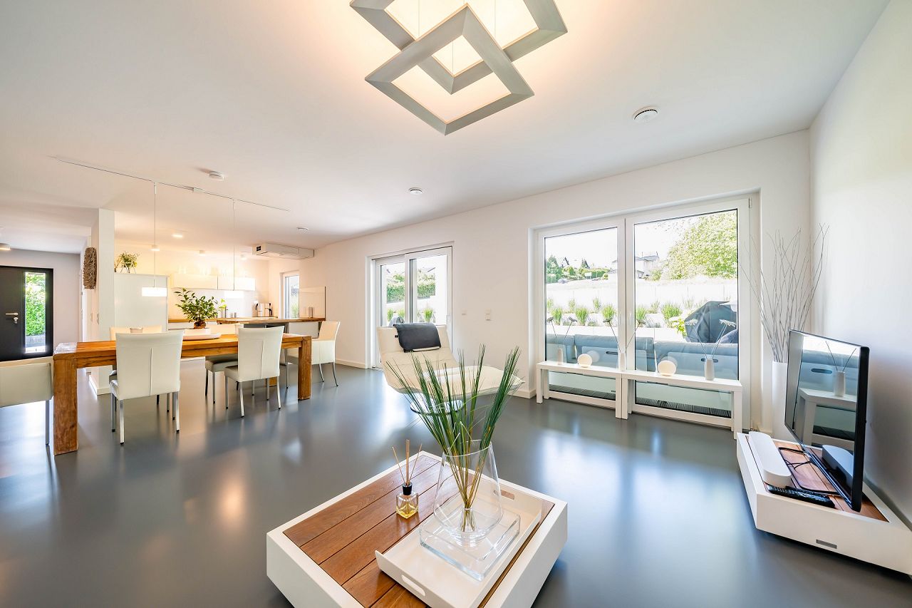 Der Fertighaus Bungalow mit Garage wurde auch im Inneren stilsicher und im Sinne der Bauhausarchitektur ausgestattet und möbliert. Besonders funktional ist die schöne Küche mit Kochtheke und Hochstühlen. Sie bietet viel Stauraum und Arbeitsfläche, die Elektrogeräte wie Backofen und Dampfgarer wurden in einen Hochschrank integriert und sind rückenschonend zu bedienen. Über eine Terrassentür geht es direkt aus der Küche auf die schöne Terrasse. Vom Ess- und Wohnbereich geht es über eine Panorama-Hebeschiebetüre und eine doppelflügelige Terrassentür ebenfalls auf die Terrasse und die geschützte Loggia.