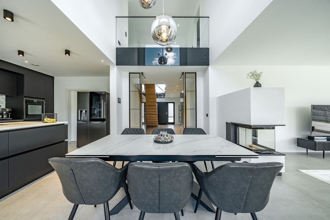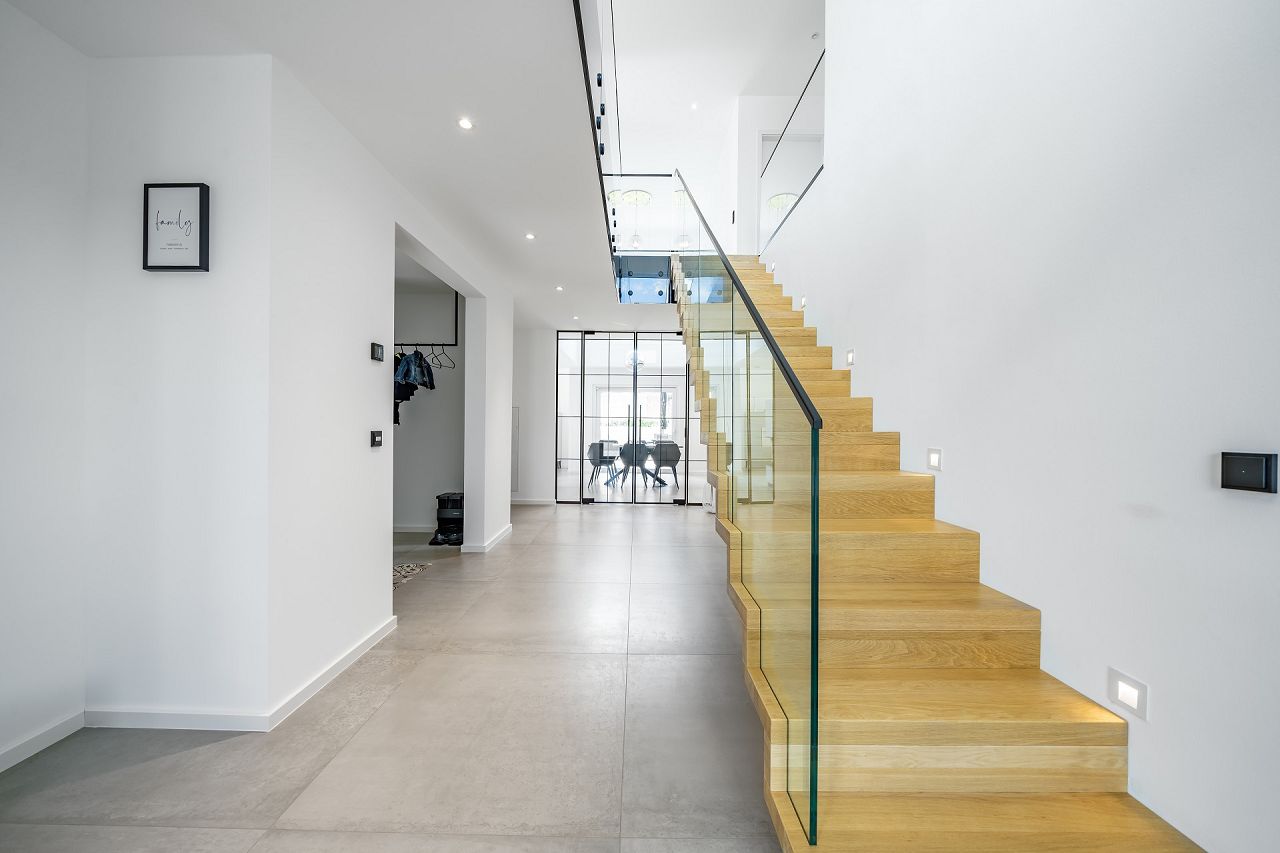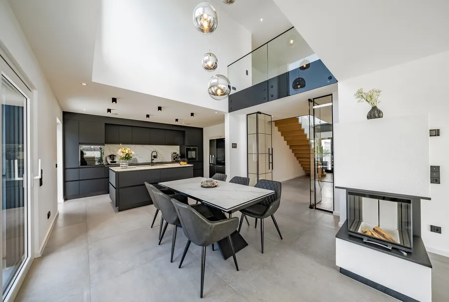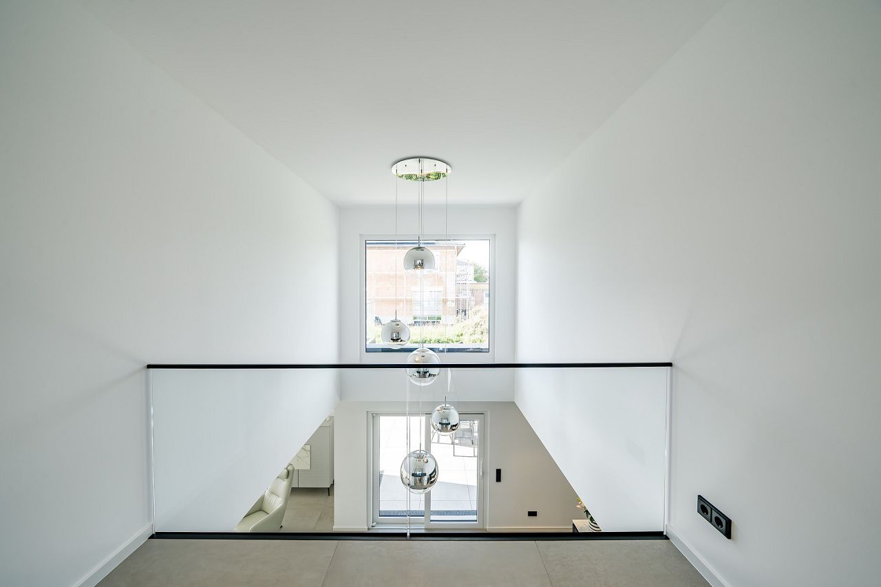 Transparent und großzügig ist der Eingangsbereich im Erdgeschoss gestaltet. Eine klare Raumstruktur mit einer meisterlichen Faltwerktreppe und raumhohen Lofttüren unterstreichen den puristischen Stil. Großräumig öffnet sich der Wohn-/Ess- und Kochbereich mit einer Galerie ins Obergeschoss. Drei große Panorama-Hebeschiebetüren verbinden das Drinnen mit dem Draußen. Die ausgewählte Ausstattung und das stilvolle Interieur strahlen zeitlose Eleganz aus. Besonders praktisch, und ganz im Sinne des Bauhauskonzeptes, befindet sich neben der Küche ein praktischer Hauswirtschaftsraum. Gegenüberliegend finden der Gästebereich mit Gästebad Platz und ein Homeoffice. Das Raumangebot wird ergänzt durch einen großen Garderobenbereich. Klug überlegt sind auch die Räumlichkeiten hinter der Doppelgarage, die als zusätzliche Abstellfläche dienen. Das Obergeschoss bietet auf 100 m² den Rückzugsbereich der Familie. Der Elternbereich ist mit großem Bad und Ankleide en Suite umgesetzt. Die beiden behaglichen Kinderzimmer sind gegenüberliegend angeordnet, dazwischen befindet sich ein Kinder-Duschbad. Der Flurbereich ist als Galerie gestaltet. Die ausgewählten Glasgeländer unterstreichen die Leichtigkeit und Transparenz, die den Bauhausstil ausmachen.