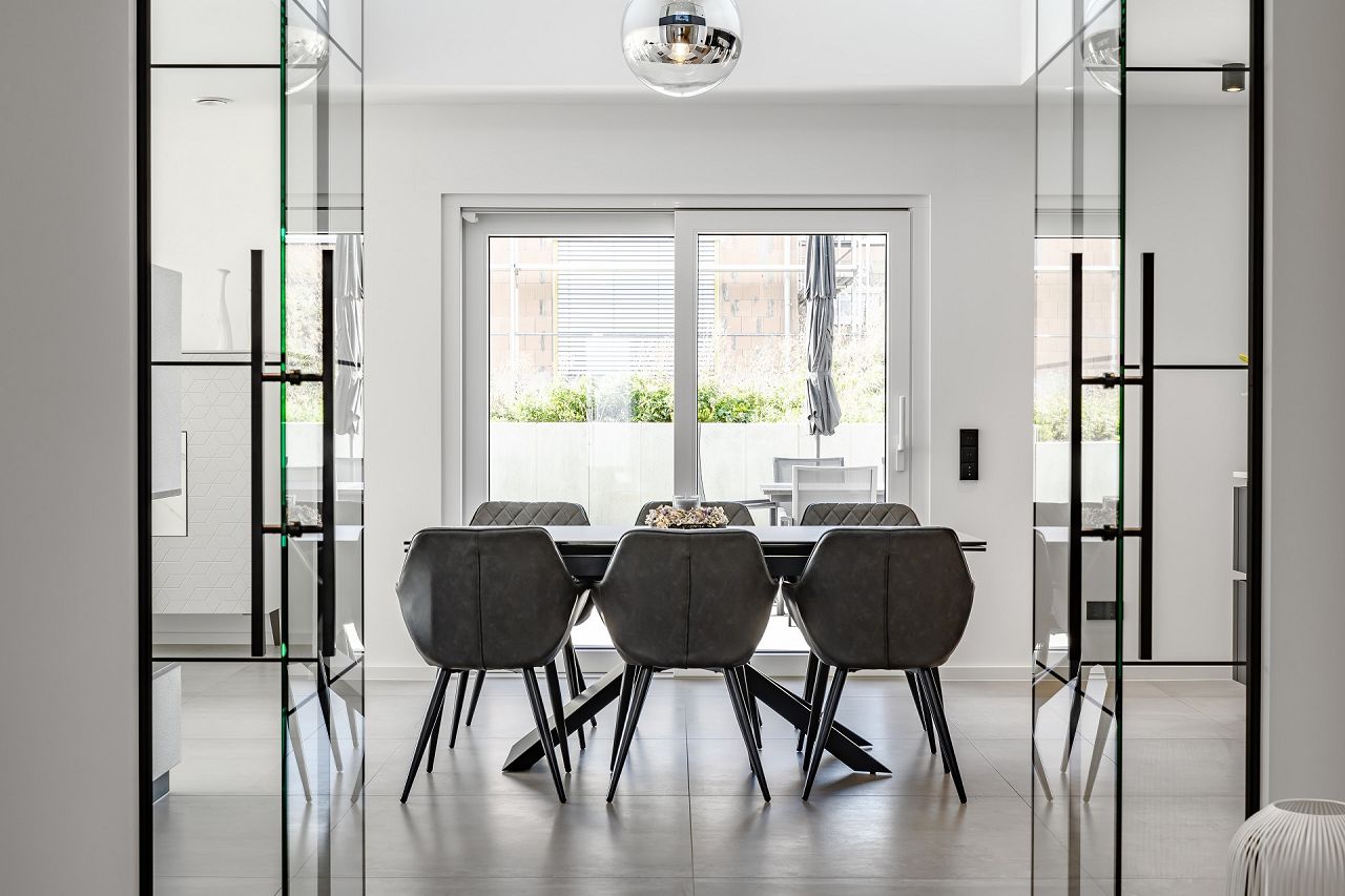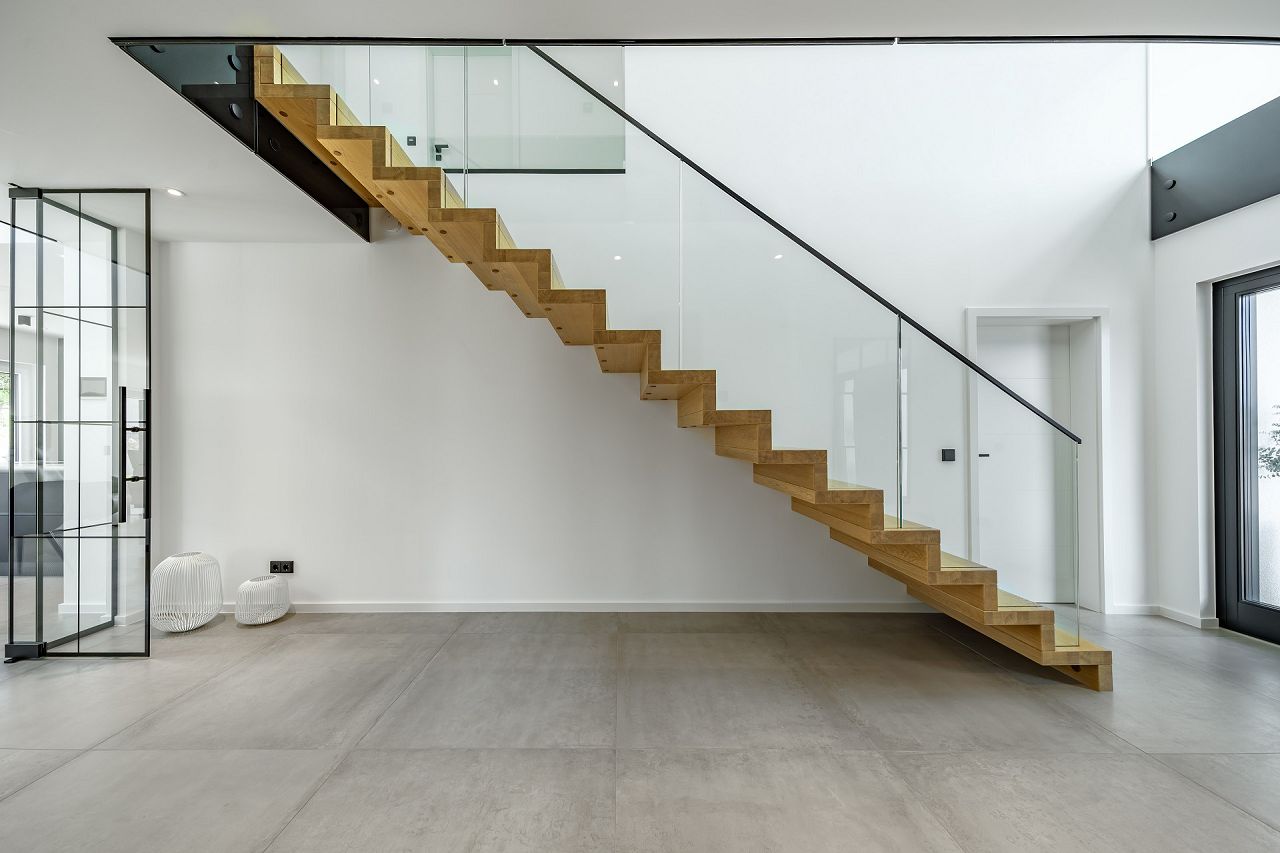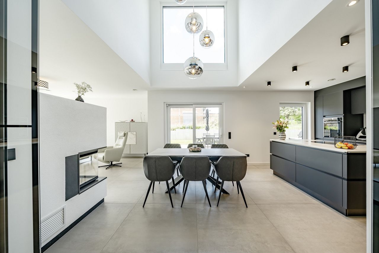Transparent und großzügig ist der Eingangsbereich im Erdgeschoss gestaltet. Eine klare Raumstruktur mit einer meisterlichen Faltwerktreppe und raumhohen Lofttüren unterstreichen den puristischen Stil. Großräumig öffnet sich der Wohn-/Ess- und Kochbereich mit einer Galerie ins Obergeschoss. Drei große Panorama-Hebeschiebetüren verbinden das Drinnen mit dem Draußen. Die ausgewählte Ausstattung und das stilvolle Interieur strahlen zeitlose Eleganz aus. Besonders praktisch, und ganz im Sinne des Bauhauskonzeptes, befindet sich neben der Küche ein praktischer Hauswirtschaftsraum. Gegenüberliegend finden der Gästebereich mit Gästebad Platz und ein Homeoffice. Das Raumangebot wird ergänzt durch einen großen Garderobenbereich. Klug überlegt sind auch die Räumlichkeiten hinter der Doppelgarage, die als zusätzliche Abstellfläche dienen. Das Obergeschoss bietet auf 100 m² den Rückzugsbereich der Familie. Der Elternbereich ist mit großem Bad und Ankleide en Suite umgesetzt. Die beiden behaglichen Kinderzimmer sind gegenüberliegend angeordnet, dazwischen befindet sich ein Kinder-Duschbad. Der Flurbereich ist als Galerie gestaltet. Die ausgewählten Glasgeländer unterstreichen die Leichtigkeit und Transparenz, die den Bauhausstil ausmachen.