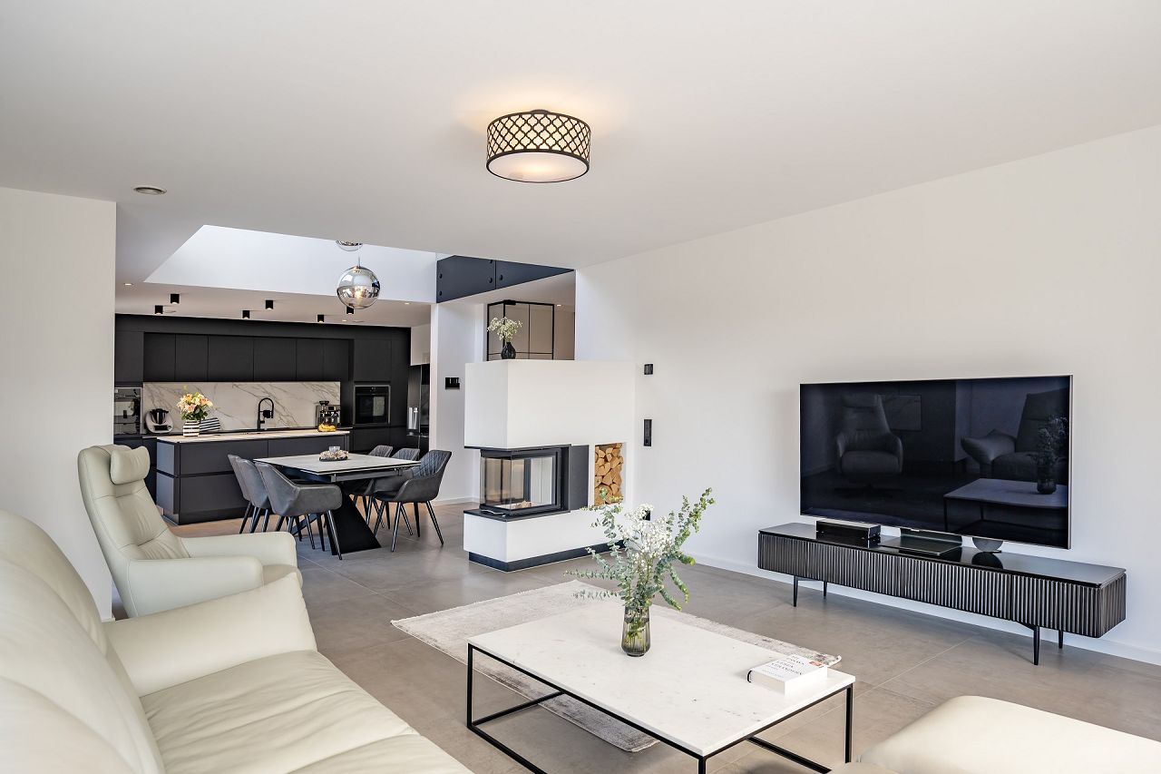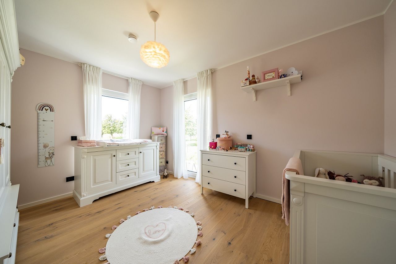 „Wir haben uns sehr gut in unserem Haus eingelebt und können jeden Tag das tolle Raumklima genießen. Neben der optischen Gestaltung haben wir Wert auf alltagstaugliches Wohnen gelegt. Zum Beispiel beim Elternschlafzimmer mit direkter Anbindung ans Elternbad und ein Ankleidezimmer, beim Kinderbad, das zwischen den beiden Kinderzimmern geplant ist, und einem Wäscheabwurfschacht. Auch die Steuerung der Beleuchtung, der Rollläden und der Haustür mittels Smart-Home ist komfortabel. Die Doppelgarage bietet einen Zugang zum Hauswirtschaftsraum, die Küche einen Zugang zur Terrasse.“
