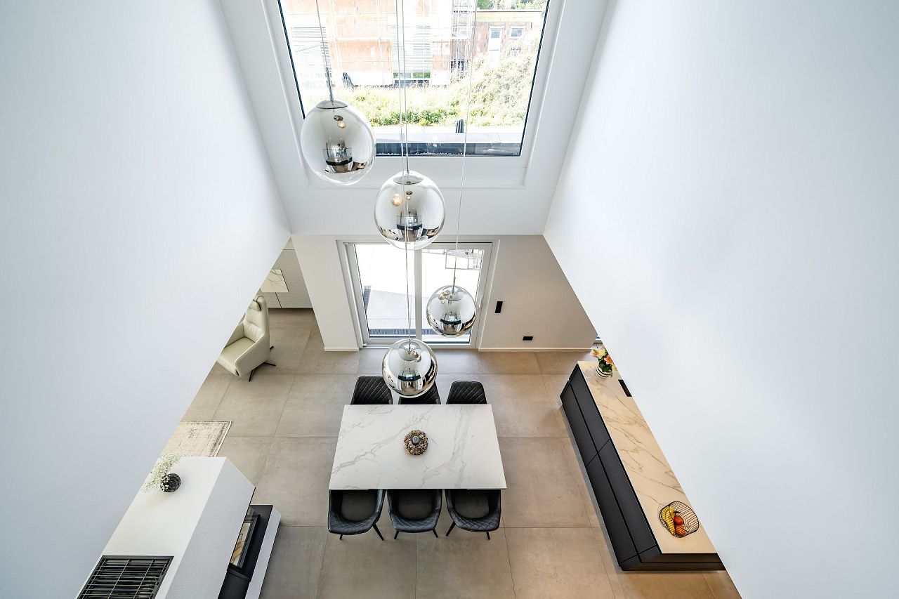 Was war Ihnen bei der Planung besonders wichtig? „Insgesamt war uns - in Anlehnung an den Bauhausstil - eine geradlinige und puristische Gestaltung im Außen- und Innenbereich wichtig. Dementsprechend haben wir außen kubische Formen und Geschossüberstände gewählt. Im Innenraum des Hauses war uns eine offene Gestaltung mit großem Eingangsbereich, Lufträumen, Faltwerktreppe, Lofttür, Galerie und Glaselementen in Kombination mit neutralen, ruhigen Farben wichtig.“
