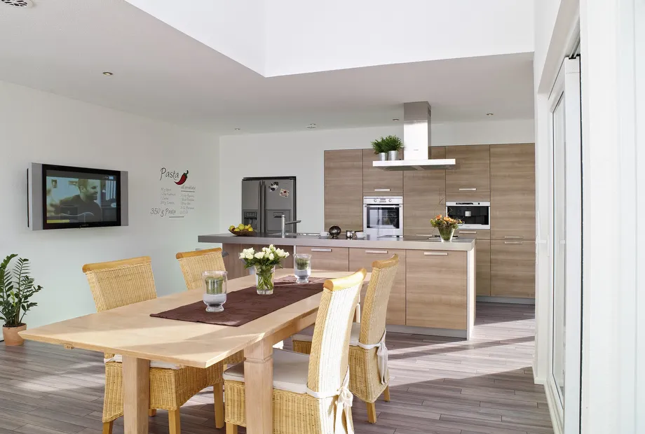 Auf einer Grundfläche von 80 m², die je Geschoss vom Hersteller STREIF realisiert wurden, wird in der Stadtvilla im Bauhausstil ein wahrer Wohntraum wahr. Für die offen gestaltete Küche mit Kochtresen und den Essbereich stehen geräumige 34 m² zur Verfügung.