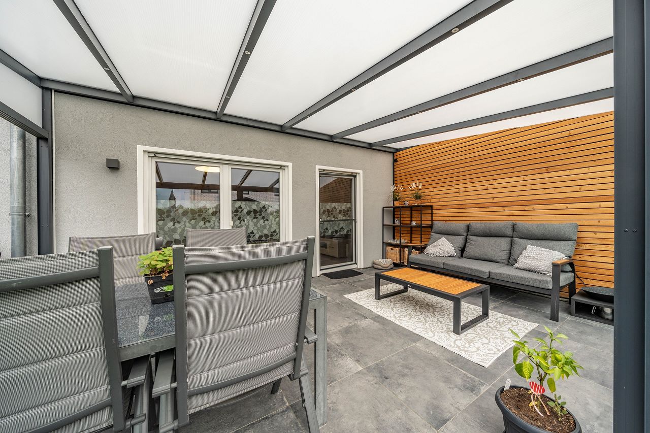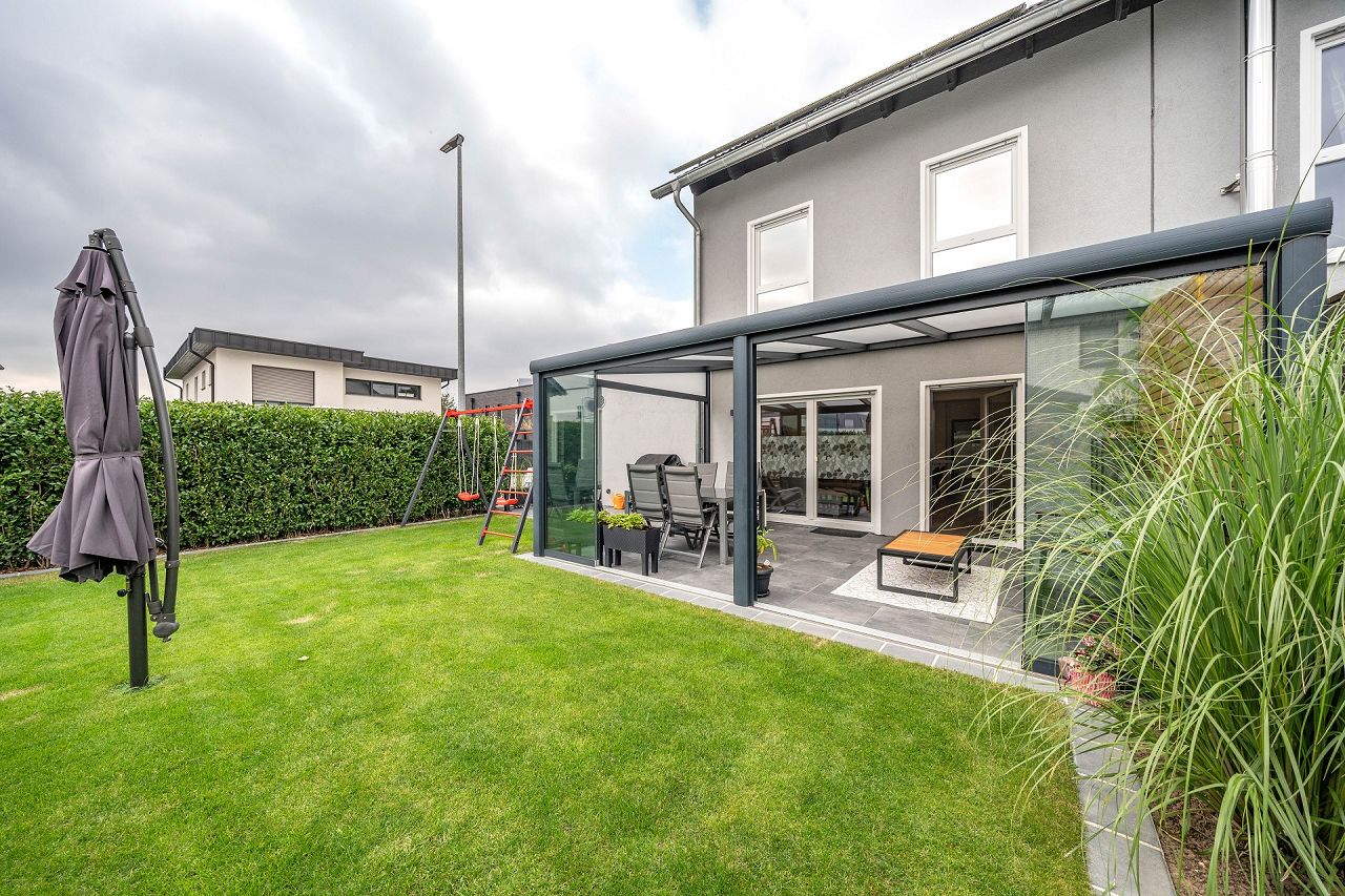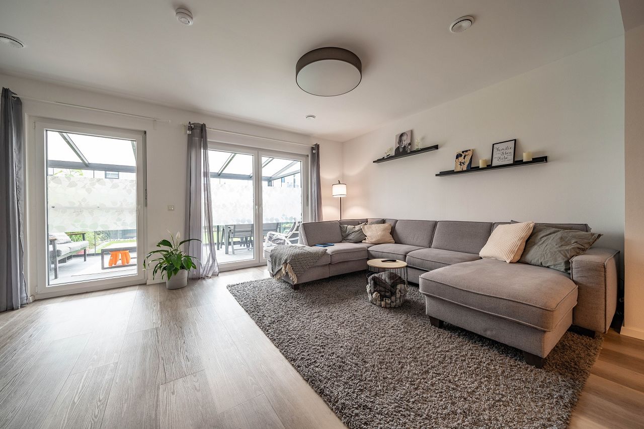 Der Wohn- und Essbereich öffnet sich zum Garten mit drei Terrassentüren. Das bringt besonders viel Licht in Räume und lässt sie auch größer erscheinen. Die Terrassen-Abtrennung zur benachbarten Haushälfte hat die Baufamilie mit einer superschönen Holzverkleidung versehen. Ein wintergartenähnlicher, überdachter Anbau verzaubert die Terrasse in ein zweites Outdoor-Wohnzimmer. Die Anordnung von Küche, Wohn- und Essbereich ist schön und praktisch. Die Schlafräume sind ebenfalls lichterfüllt und behaglich eingerichtet und ausgestattet. Unterm Dach ist ein schickes Homeoffice eingezogen. Der zweite große Raum im DG wird derzeit noch nicht genutzt.