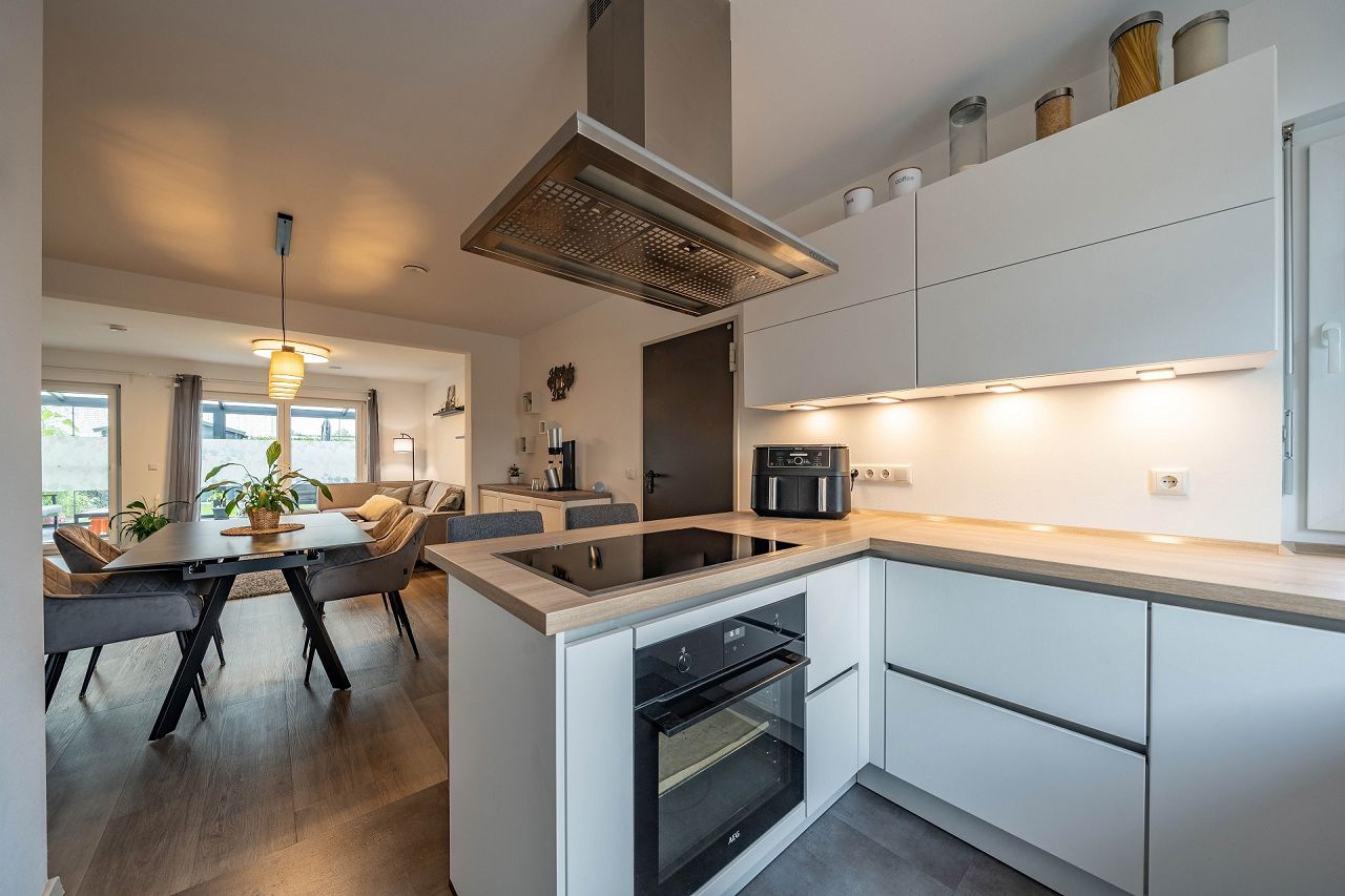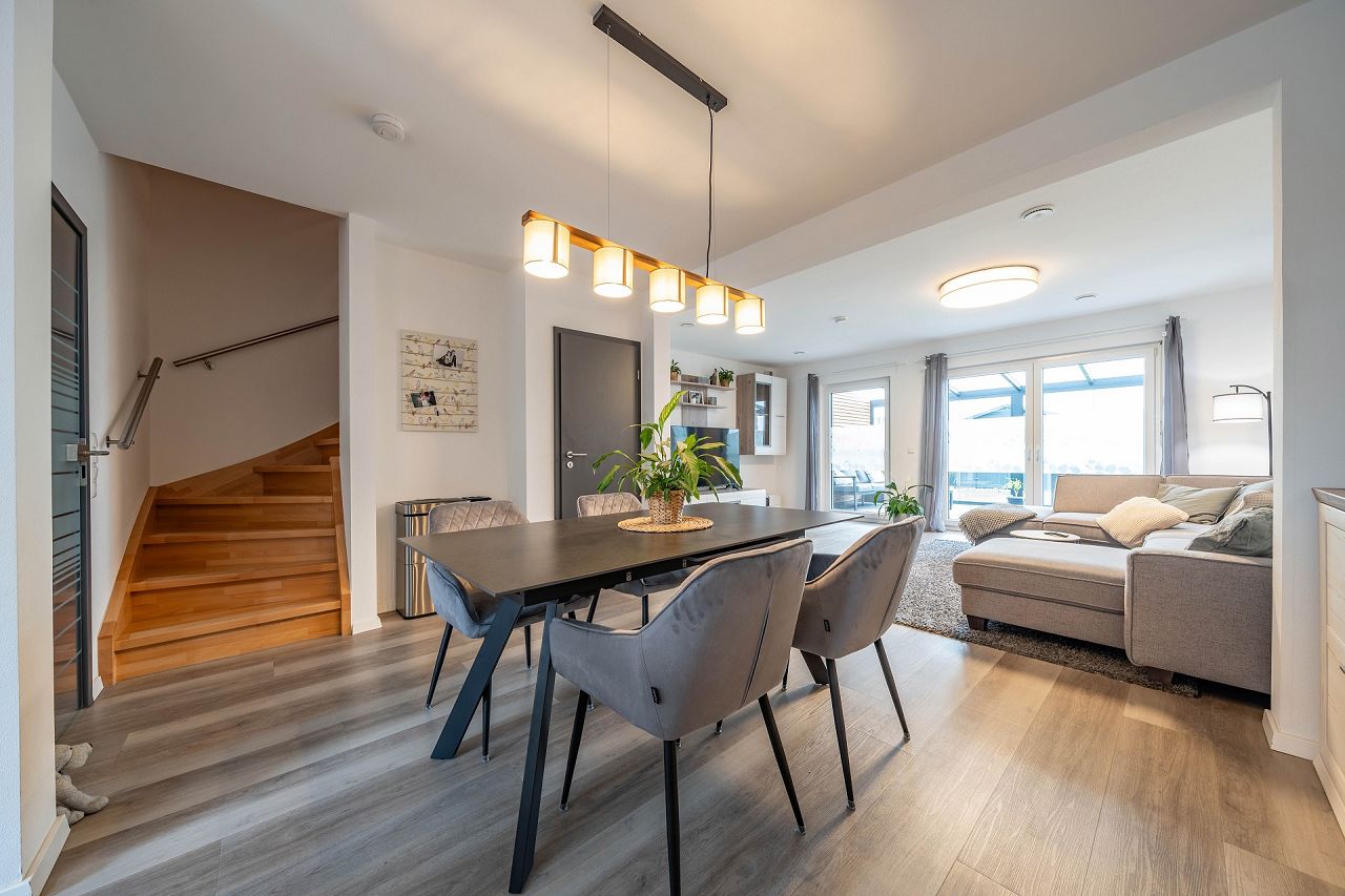 "Unser Haus gefällt uns von der Aufteilung sehr gut. Wir konnten die Grundrisse nach unseren Wünschen gestalten. Wir leben hier als kleine Familie sehr gerne und fühlen uns sehr wohl in unseren eigenen vier Wänden. Wir mögen unseren großen, offenen Wohn-Essbereich sehr. Auch unser "Harry Potter" Raum unter der Treppe ist eine super Lagermöglichkeit für die ganzen Gesellschaftsspiele, die am Wochenende mit der ganzen Familie gespielt werden. Die Punktlasst der Wände, um etwas aufzuhängen, ist auch sehr hoch. Das Haus ist sehr hochwertig und nachhaltig, was für uns auch sehr wichtig war."