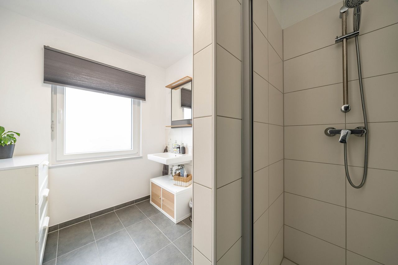Im Dachgeschoss befinden sich zwei Räume, die mittig von einem Duschbad und dem Treppenhaus mit Flur getrennt sind.
