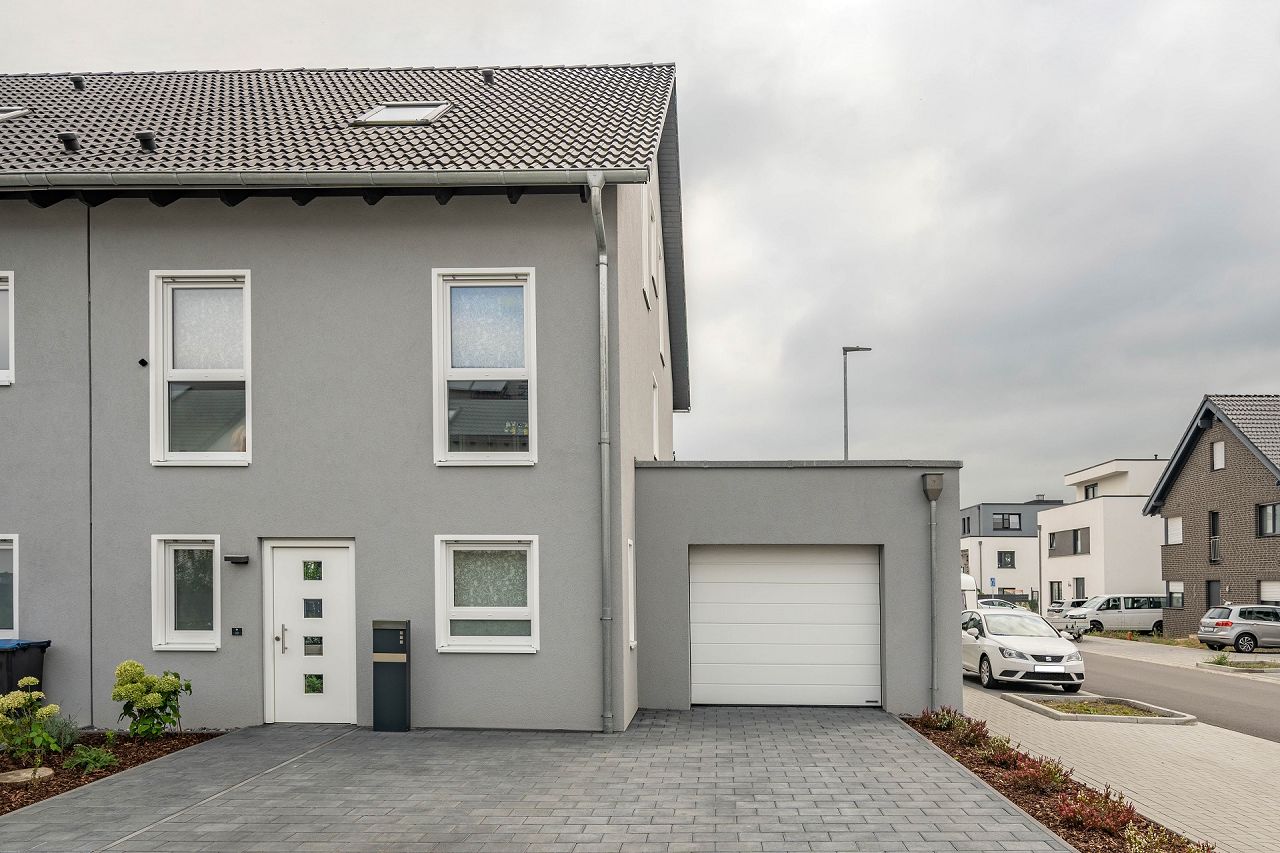 Die 2,5-geschossige Doppelhaushälfte wird geprägt von den ausgewählten Fensterformaten, einem Satteldach und der angebauten Garage. Durch die hellgraue Farbe des Verputzes werden die weißen Fenster und die weiße Haustür in Szene gesetzt. Die Kombination wirkt besonders behaglich.
