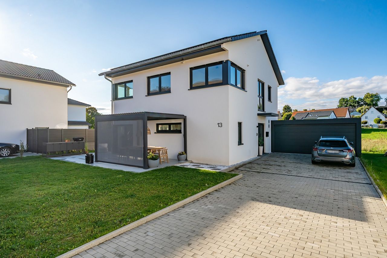 Die Hausarchitektur ist als modernes Einfamilienhaus mit einem Satteldach angelegt. Sehr besonders sind die Fensterformate, die dem Haus ein Gesicht geben. Übereckfenster und -terrassentüren öffnen die Räume großzügig zur Terrasse und in den Garten. Eine edle Terrassenüberdachung und ein Haustürvordach setzen Akzente.