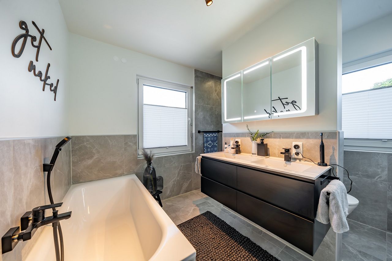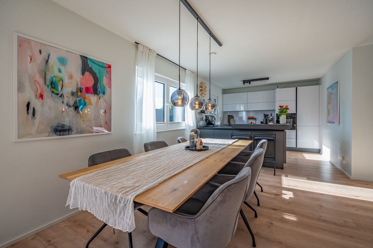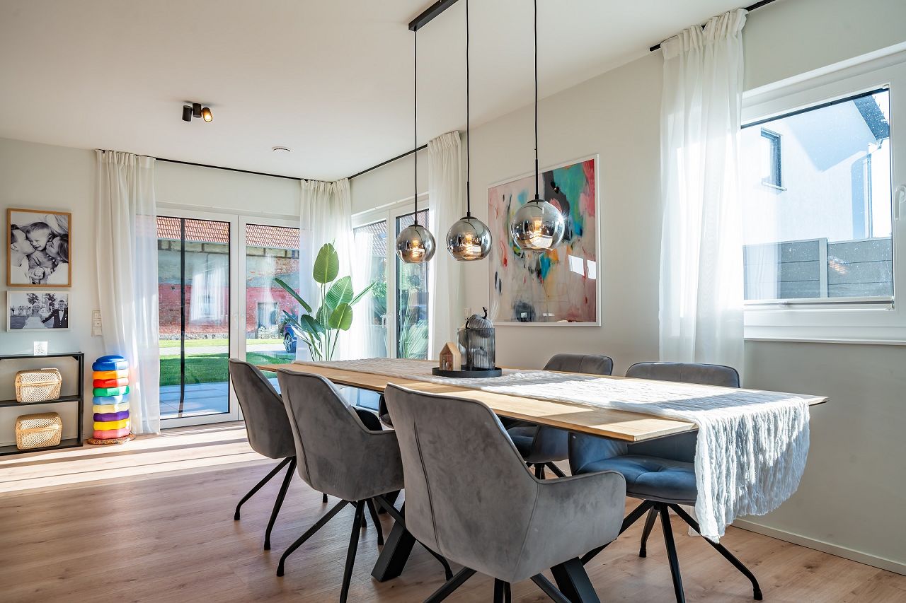 Ein lichterfüllter, offen gestalteter Wohn-, Ess- und Kochbereich ist das Herzstück des Hauses. Im Zentrum steht ein großer Esstisch, der für 8 Personen Platz bietet. Die Wohnlandschaft mit TV ist als Rückzugsbereich mit schmalen Fenstern gekennzeichnet. Die Küche punktet im Schwarz-Weiß-Design und bietet in L-Form auch einen Kochtresen. Sie ist so platziert im Grundriss, dass der Küchenbereich nicht direkt aus der Diele einsehbar ist. Eine geradläufige dunkle Treppe mit einer halbhohen Brüstungswand setzt ein Statement. Der Dielenbereich ist mit stilvollen Einbauschränken ebenfalls im Weiß-Schwarz-Look gestaltet und bietet viel Stauraum. Ergänzt wird der Bereich mit einem Gäste-WC im passenden Style. Weiße Fenster innen und weiße Zimmertüren bilden mit dem Fußboden in Holzoptik ein sehr gutes Team für ein modernes, und zugleich behagliches Ambiente. Im Obergeschoss fungiert die Ankleide als Raumteiler zwischen dem Elternschlafbereich und dem En-suite-Bad. Auch hier hat das Bauherrenpaar alle Details stimmig ausgewählt und arrangiert. Drei weitere Zimmer mit einem Duschbad komplettieren das Obergeschoss.