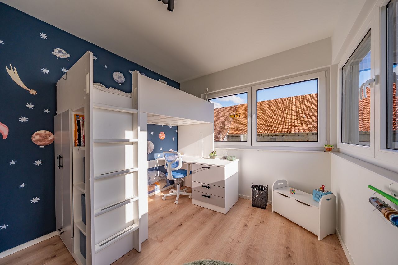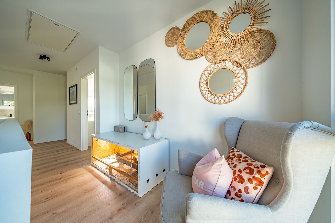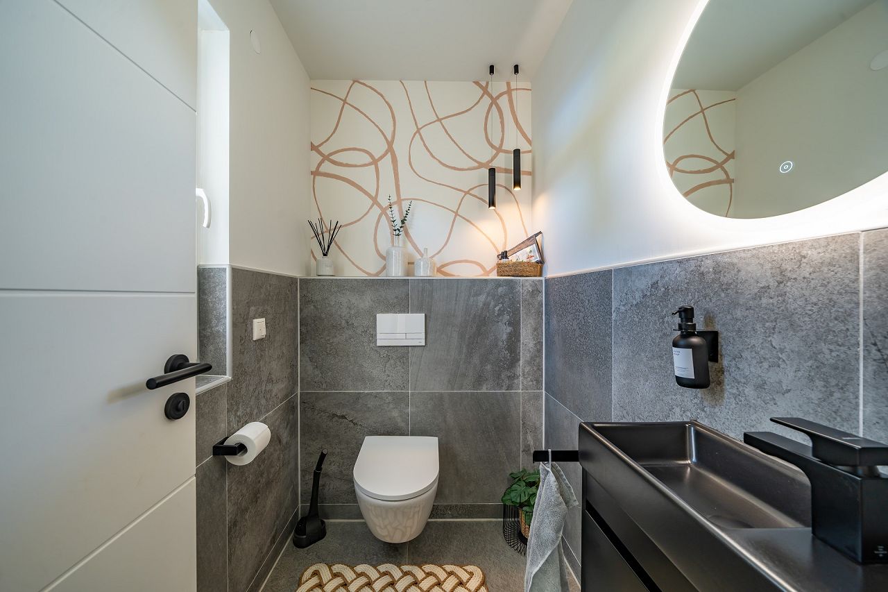 Ein lichterfüllter, offen gestalteter Wohn-, Ess- und Kochbereich ist das Herzstück des Hauses. Im Zentrum steht ein großer Esstisch, der für 8 Personen Platz bietet. Die Wohnlandschaft mit TV ist als Rückzugsbereich mit schmalen Fenstern gekennzeichnet. Die Küche punktet im Schwarz-Weiß-Design und bietet in L-Form auch einen Kochtresen. Sie ist so platziert im Grundriss, dass der Küchenbereich nicht direkt aus der Diele einsehbar ist. Eine geradläufige dunkle Treppe mit einer halbhohen Brüstungswand setzt ein Statement. Der Dielenbereich ist mit stilvollen Einbauschränken ebenfalls im Weiß-Schwarz-Look gestaltet und bietet viel Stauraum. Ergänzt wird der Bereich mit einem Gäste-WC im passenden Style. Weiße Fenster innen und weiße Zimmertüren bilden mit dem Fußboden in Holzoptik ein sehr gutes Team für ein modernes, und zugleich behagliches Ambiente. Im Obergeschoss fungiert die Ankleide als Raumteiler zwischen dem Elternschlafbereich und dem En-suite-Bad. Auch hier hat das Bauherrenpaar alle Details stimmig ausgewählt und arrangiert. Drei weitere Zimmer mit einem Duschbad komplettieren das Obergeschoss.