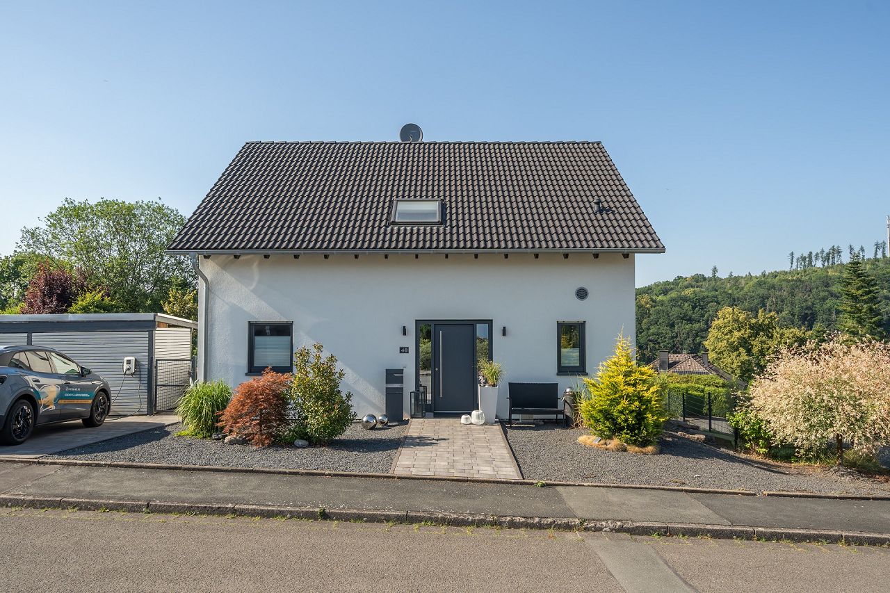 Die Architekturdes 2,5-geschossigen Einfamilienhauses von Familie May wird durch einen Flachdacherker und moderne Fensterformate geprägt. Das Grundstück liegt in einer Hanglage und bietet eine herrliche Aussicht ins Grüne. In Eigenregie hat Baufamilie May noch eine Mülleinhausung mit E-Ladeeinheit realisiert.
