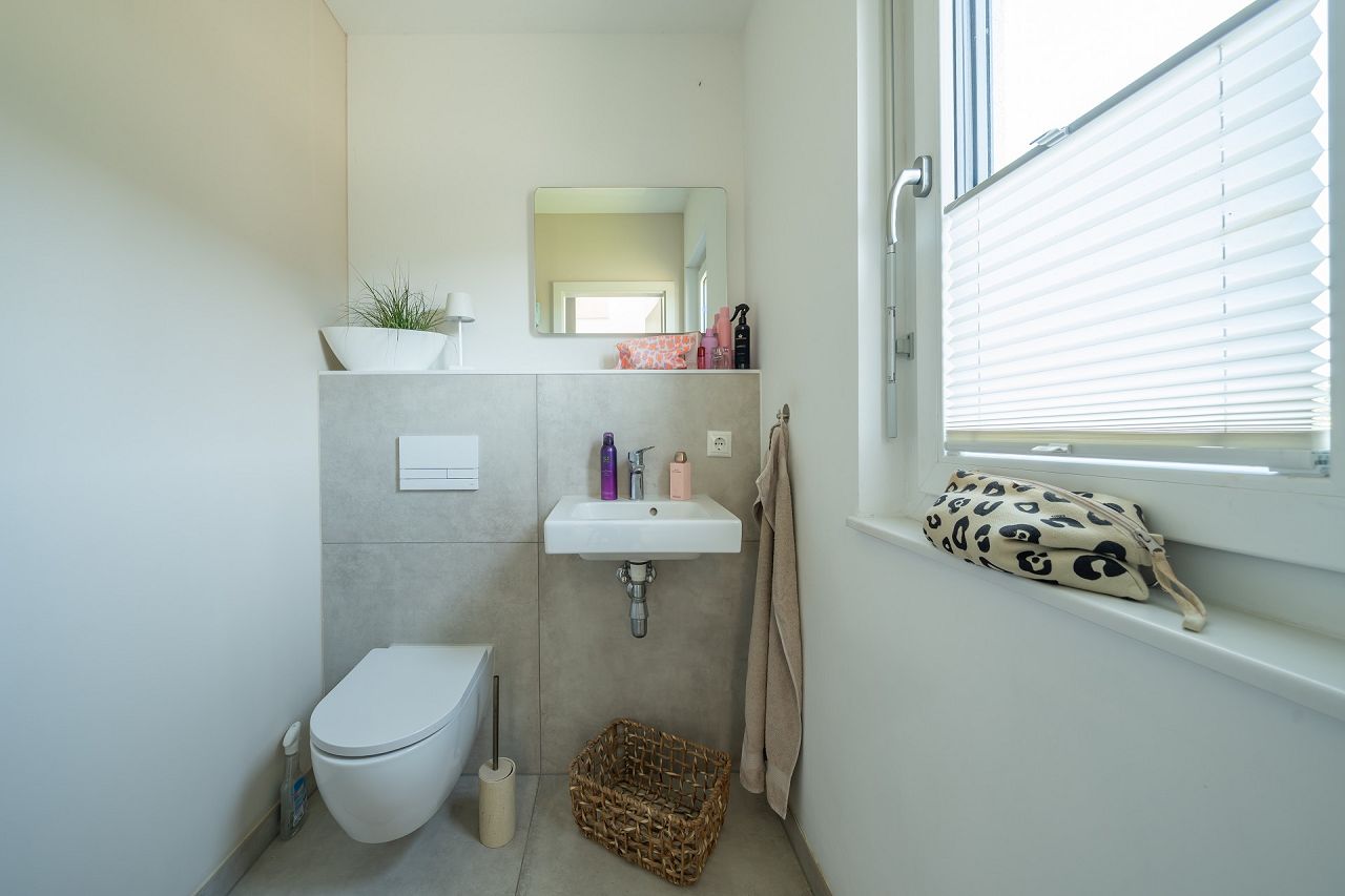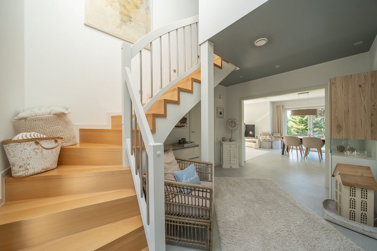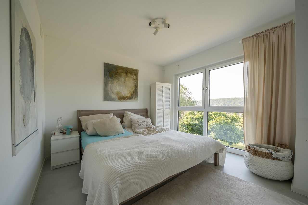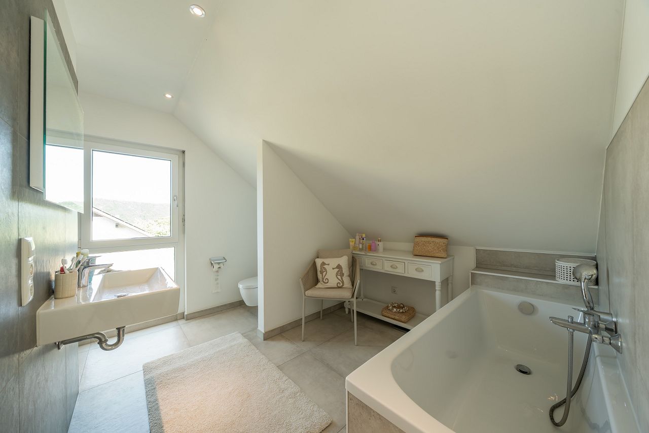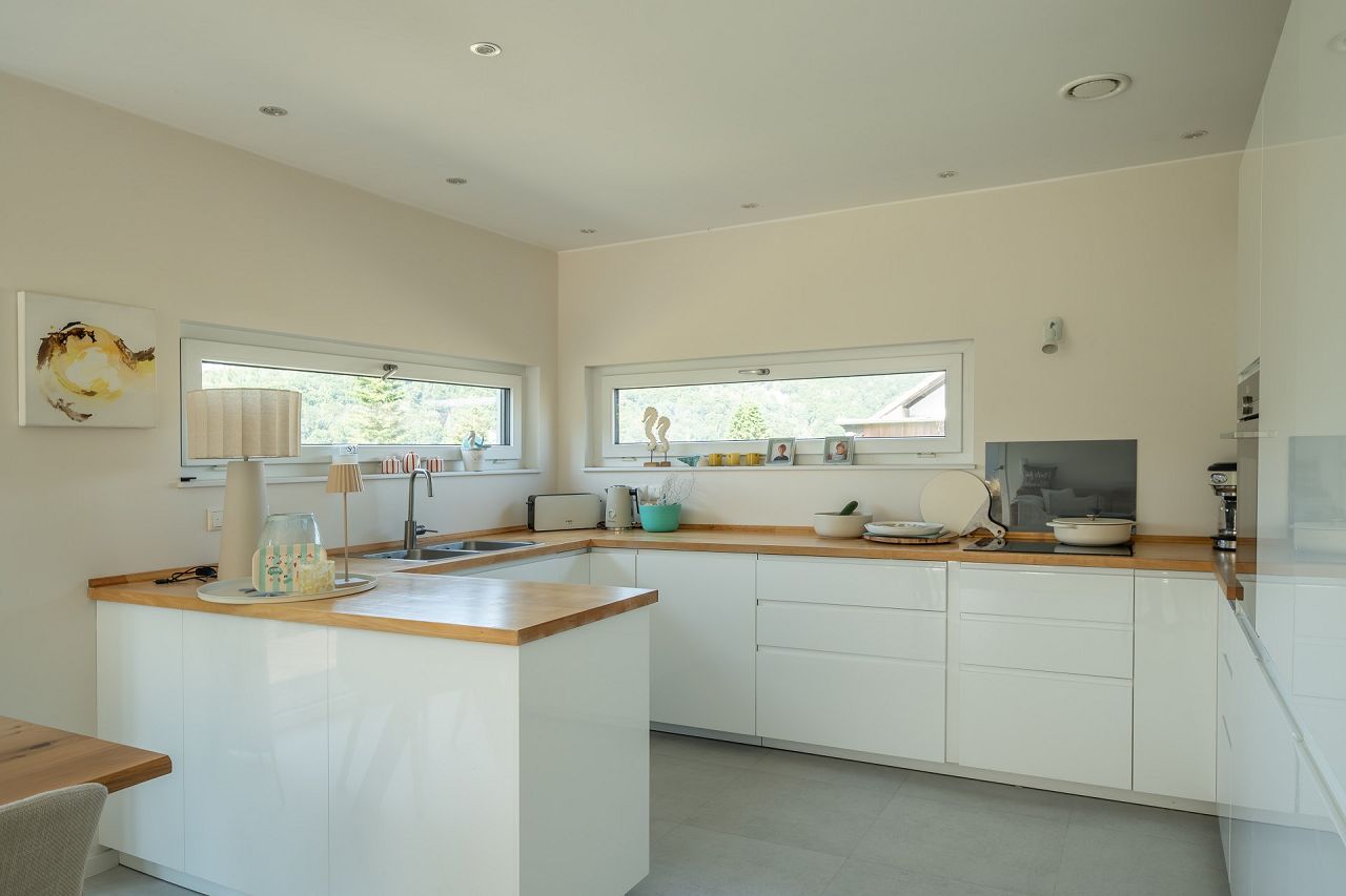 Bei den Fenstern und Terrassentüren hat Familie May sich für die Farbe anthrazit außen und innen für die Farbe Weiß entschieden. Der Küchenbereich ist wie ein Cockpit angeordnet und wird von modernen, liegenden Fensterformaten übereck inszeniert. Im Erkerbereich ist vor einer doppelflügeligen Terrassentür der Esstisch platziert. Der Wohnbereich punktet mit Terrassentüren übereck. Hell, freundlich und behaglich ist die Ausstattung und das Interieur von Familie May. Der Durchgangsbereich in die Diele ist komplett offen gestaltet. Die gewendelte Treppe ist mit Tritt- und Setzstufen in massiver Buche ausgeführt. Das Geländer wurde weiß lackiert und mit Edelstahlstäben ausgewählt. Diese Kombination wirkt modern und behaglich zugleich. Mit einem dachschrägen Fenster wird die Diele und das Treppenhaus vom Tageslicht erfüllt. Die Bäder sind ebenfalls stilvoll ausgestattet worden. Für eine gute Grundbeleuchtung sorgen Deckenspots. Der Flurbereich im Dachgeschoss ist als Galerie gestaltet und bietet eine stilvolle Verbindung zwischen den Schlafzimmern und dem Bad. Das Ankleidezimmer und der Elternschlafbereich sind auf 22 m² komfortabel angeordnet und bieten beide eine traumhafte Aussicht ins Grüne. Das Bad im Dachgeschoss wurde mit einer T-Lösung  gestaltet. Der Look strahlt moderne Behaglichkeit aus.