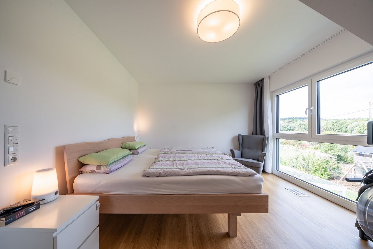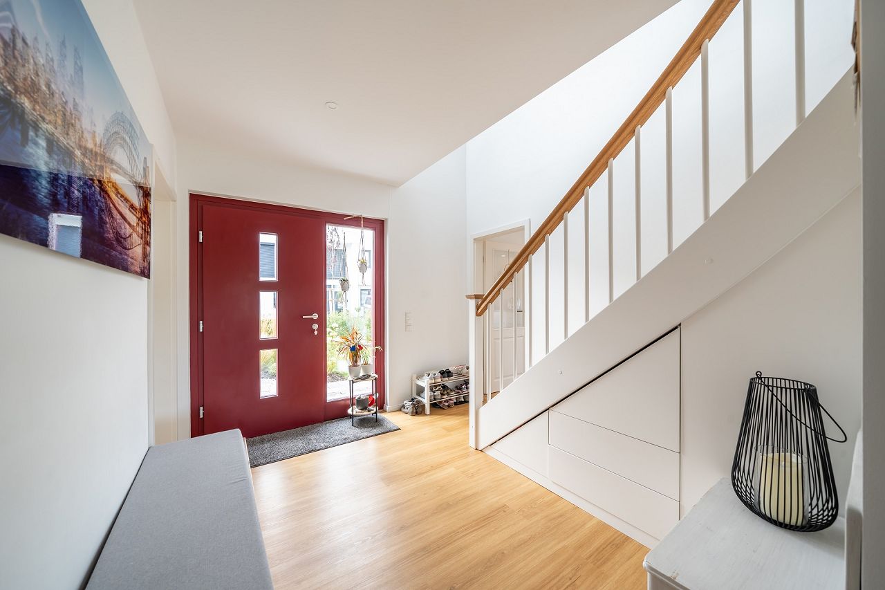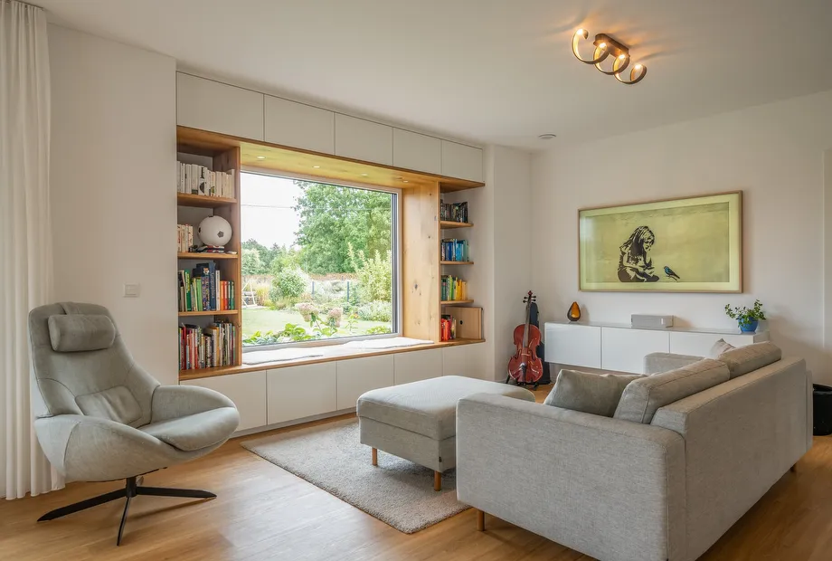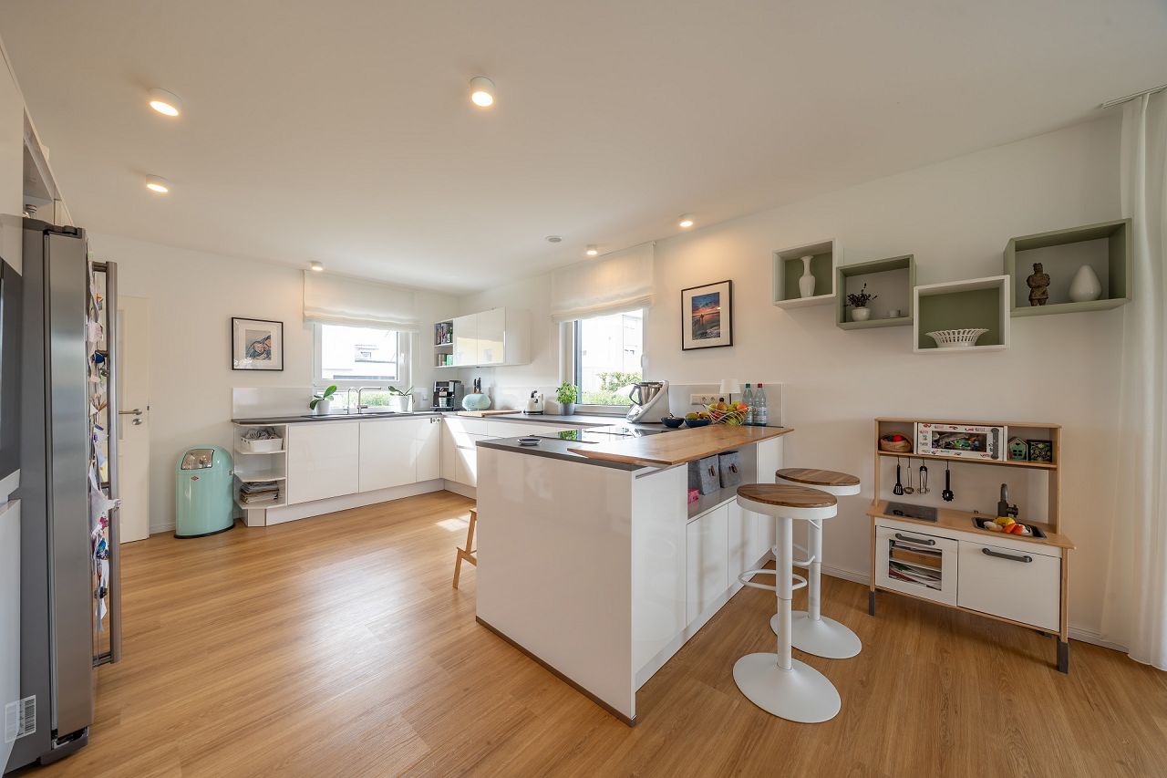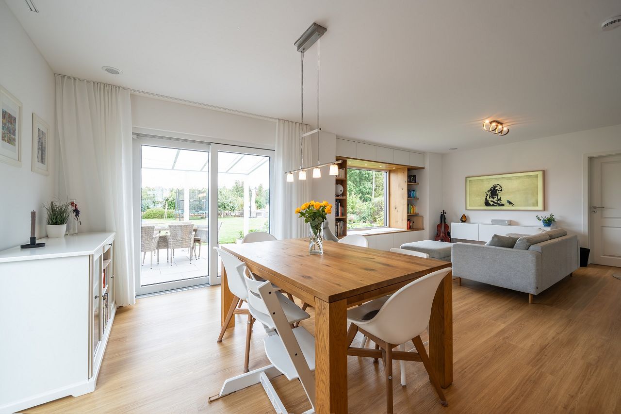 Das besondere Highlight am Haus ist der 2-geschossige Flachdacherker, der im Erdgeschoss im Wohnbereich mit einem Panoramafenster ausgestattet ist. Familie Schulz hat das Panoramafenster als Sitzfenster mit Regalen, Schubkästen, Türen und Beleuchtung nach Maß ausbauen lassen. So ist ein Lieblingsplatz entstanden, der augenblicklich zum Erholen, Genießen und Entspannen einlädt. Ein großer Esstisch wurde in der Nähe der Panorama-Hebeschiebetüre mit direktem Ausgang auf die Terrasse platziert. Die Küche ist übereck angeordnet, so ist sie für Gäste und Besucher nicht direkt einsehbar. Die Küche in U-Form bietet viel Arbeitsfläche und Stauraum. Der Wohn-, Ess- und Kochbereich punktet mit komfortablen 50,9 m². Großartig ist die Versorgung mit Tageslicht von drei Seiten. Somit wird der Wohn-, Ess- und Kochbereich zu allen Tageszeiten vom Licht verwöhnt. Neben dem Wohnbereich befindet sich noch ein Zusatzraum, der als Büro und Gästezimmer genutzt wird. Der Dielenbereich mit einer Galerie heißt Gäste und Bewohner gleichermaßen willkommen. Neben der Diele rechts befindet sich ein Duschbad und der Haustechnik-/Hauswirtschaftsraum. Die Grundrissgestaltung im Erdgeschoss ist für das Wohnen auf einer Etage geeignet. Das Interieur von Familie Schulz strahlt eine elegante Natürlichkeit aus. Die Fensterrahmen sind außen in Schwarz und Innen in Weiß ausgeführt. Die Zimmertüren, die Küchenfronten und das Mobiliar sind ebenfalls in Weiß. Gemeinsam mit einem Fußboden in Holzoptik ist die Wirkung edel und behaglich zugleich.