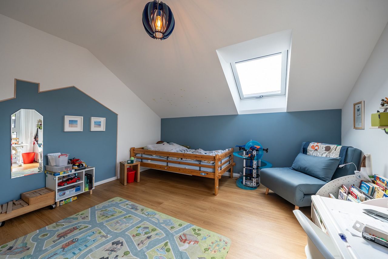 Im Dachgeschoss sind zwei schöne Kinderzimmer geplant. Der Elternbereich bietet den Komfort einer großen Ankleide und das 14 m² große Familienbad bietet eine freistehende Badewanne, ein Doppelwaschbecken eine große bodengleiche Dusche und ein WC. Eine kleine Galerie akzentuiert das Treppenhaus. Vier zusätzliche Dachfenster fluten die Räume mit Tageslicht. Der Grundriss ist sehr gut strukturiert.