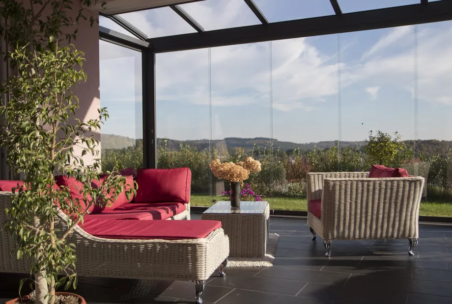 In die Hausplanung wurde direkt aufgenommen, dass die überdachte Terrasse zeitnah zu einem Wintergarten ausgebaut wird. Der Wintergarten schließt sich direkt an den Wohn-/Essbereich an und ist mit Schiebetüren realisiert worden, sodass man den Bereich auch komplett öffnen kann. Inklusive des Wintergartens verfügt der Fertighaus-Bungalow über eine Wohnfläche von 112 m².