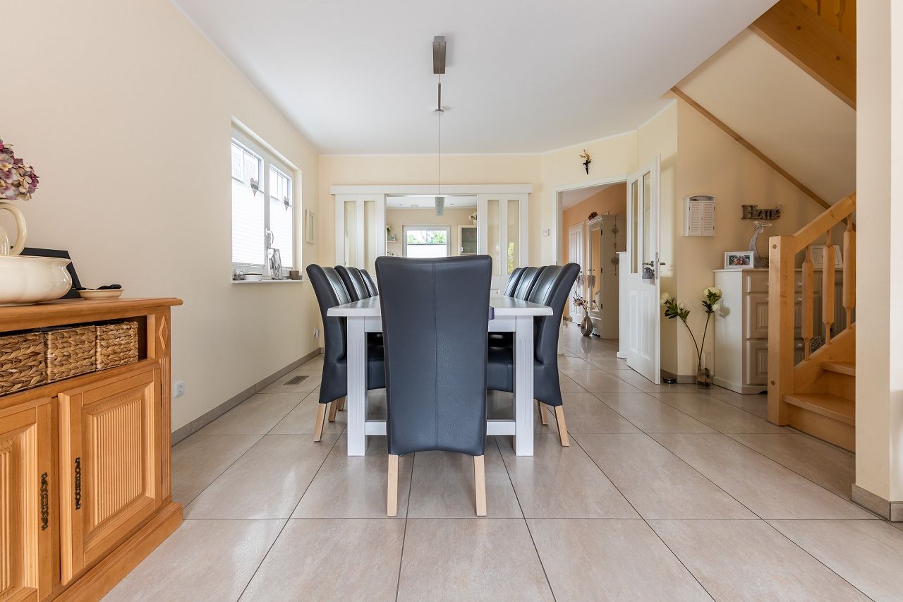 Der Bebauungsplan gab eine Klinkerfassade, die Gebäudehöhe und die Dachform vor. Das gesamte Haus von Familie Sohns ist hell und lichtdurchflutet. Die Ausstattung wurde im modernen Landhaus-Look mit Sorgfalt und Liebe zum Detail ausgewählt und gestaltet.