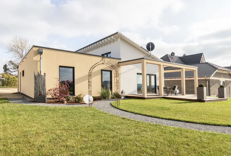 Mit diesem Bungalow ist dem Architekten durch die Kombination von Pult- und Flachdach ein außergewöhnliches Haus gelungen. Die durch die unterschiedlichen Dachformen entstandenen Hausbereiche werden mittels unterschiedlicher Farbgebung des Außenputzes weiter optisch hervorgehoben. Der Bungalow konnte als KfW40 Plus-Haus größtenteils mit einem zinsgünstigen Kredit und einem Tilgungszuschuss der KfW finanziert werden.