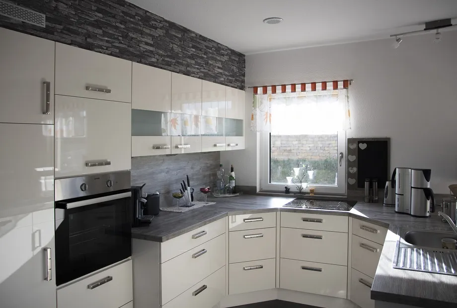 In der Küchenplanung wurde vorgesehen, dass die Küchenmöbel flächenbündig in der Wand eingebaut werden. Das sieht sehr gut aus, und auf den Oberschränken kann sich erst gar kein Staub ansammeln. Eine Esstheke verbindet die Küche mit dem Essbereich und dem Wohnzimmer.
