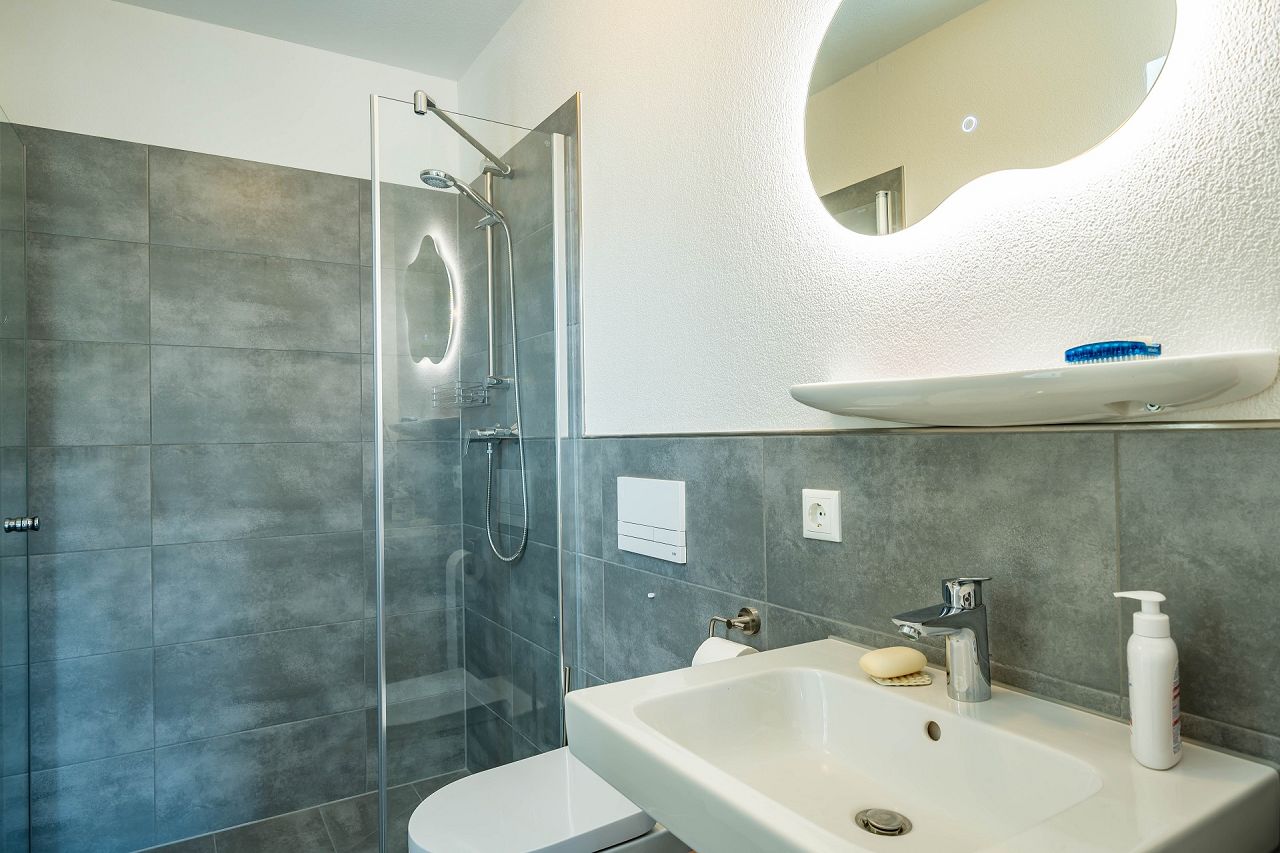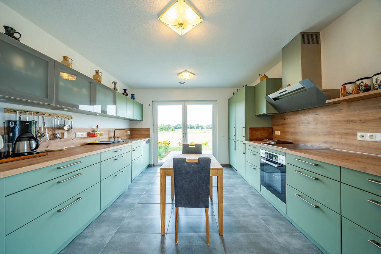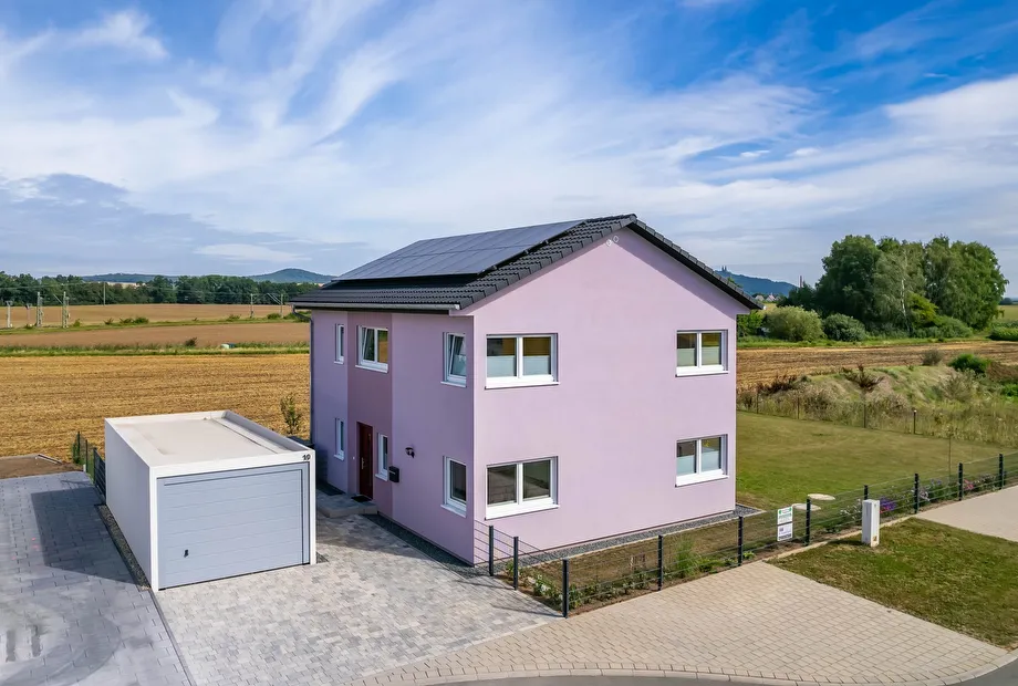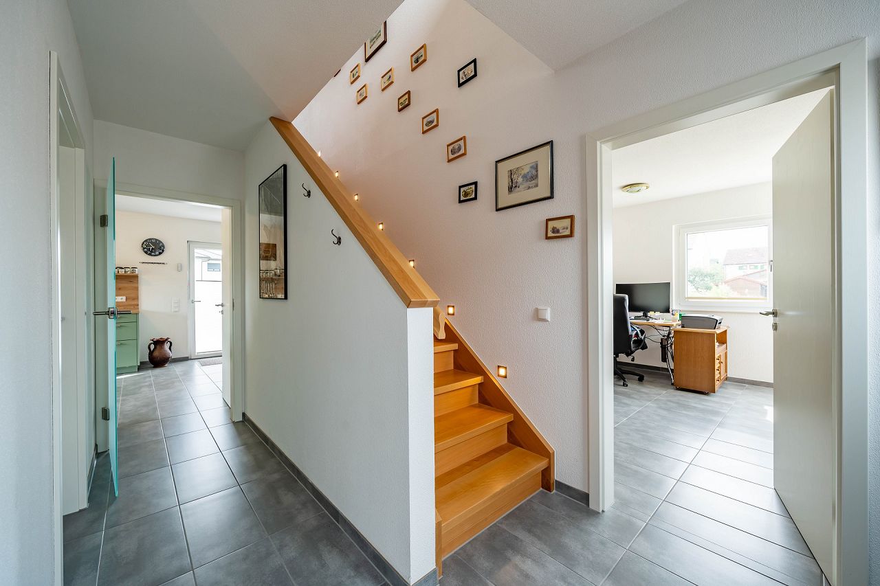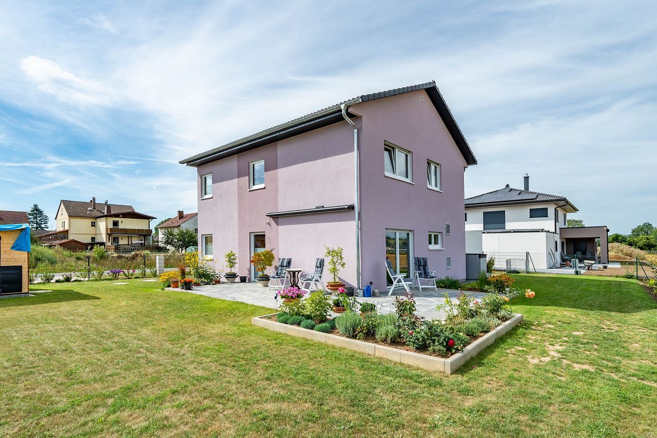 Die Architektur des Hauses ist 2-geschossig mit einem klassischen Satteldach angelegt. Das Ehepaar hat sich eine zweifarbige Fassadengestaltung in Rosétönen, eine anthrazitfarbene Dacheindeckung und Fenster außen und innen in Weiß ausgewählt. Eingezogen ins neue Zuhause ist eine Traumküche mit mintfarbenen Fronten und einer Arbeitsplatte in Holzoptik. Von der schönen Wohnküche geht es über eine doppelflügelige Terrassentür direkt auf die Terrasse und in den Garten. Die herrliche Küche ist offen zum Wohnbereich angelegt. Ein Arbeitszimmer wurde ebenfalls im Erdgeschoss vorgesehen. Das komplette Erdgeschoss ist mit graphitfarbenen Fliesen durchgängig gestaltet. Die geradläufige Treppe wurde in massiver Buche als geschlossene Variante ausgewählt. Steplights setzen die Treppe nicht nur Szene, sie sorgen auch für eine gute Beleuchtung. Unterhalb der Treppe wurde ein Abstellraum realisiert. Die Bäder wurden ebenfalls mit anthrazitfarbenen Fliesen versehen. Die gesamte Gestaltung wirkt durchgängig und durchdacht. Das Bad wurde mit einer großen, bodengleichen Dusche realisiert, so dass sie im Krankheitsfall alle Anforderungen erfüllt. Das Erdgeschoss wurde so geplant, dass bei Bedarf das Wohnen auf einer Etage möglich ist. Im Obergeschoss wurden zwei gleich große Schlafzimmer, ein großes Bad und ein Gästezimmer platziert. Der Flurbereich ist als Galerie gestaltet. Das Hausbeispiel zeigt, wie man sich auch als Best Ager seinen Haustraum erfüllen kann.