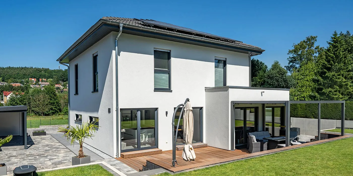 An der Gartenseite wird die Stadtvilla mit einem schönen Übereckerker in Szene gesetzt. Anschließend an den Erker wurde eine Terrassenüberdachung realisiert, die die Terrasse vom Frühling bis in den Herbst nutzbar macht. Die weiteren Gestaltungselemente sind ein Zeltdach und moderne Fensterformate. In der Farbwahl hat sich Baufamilie Veit für einen hellgrauen Putz mit anthrazitfarbenen Fenstern entschieden. Die Haustür, ebenfalls in Anthrazit, wurde mit einem zusätzlichen Glasseitenteil ausgewählt. In Eigenregie hat die Baufamilie ein elegantes Doppelcarport in Ergänzung zum Hausbau realisiert.