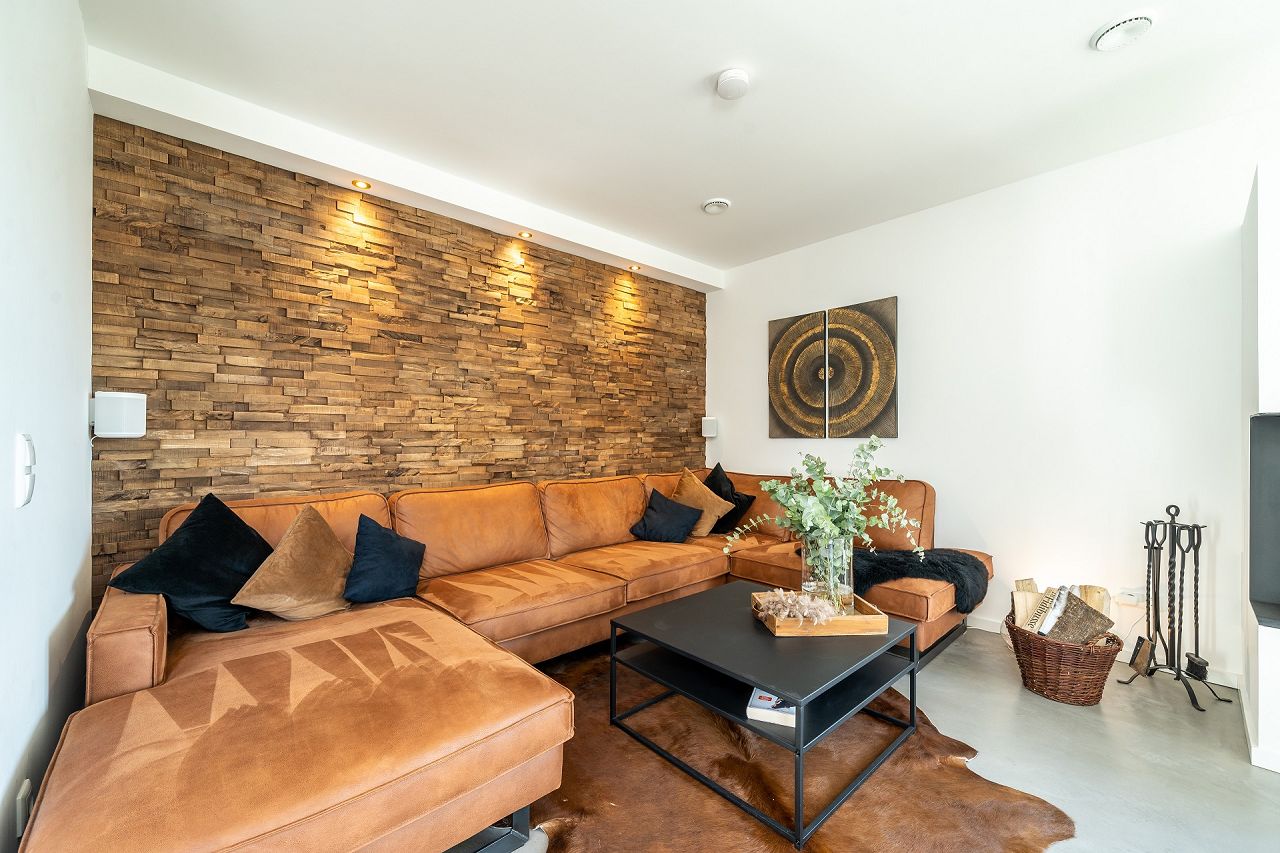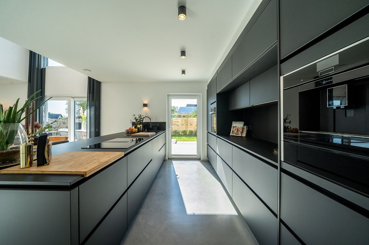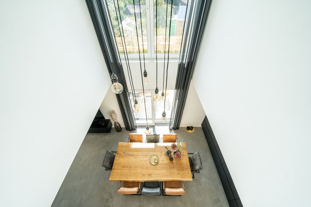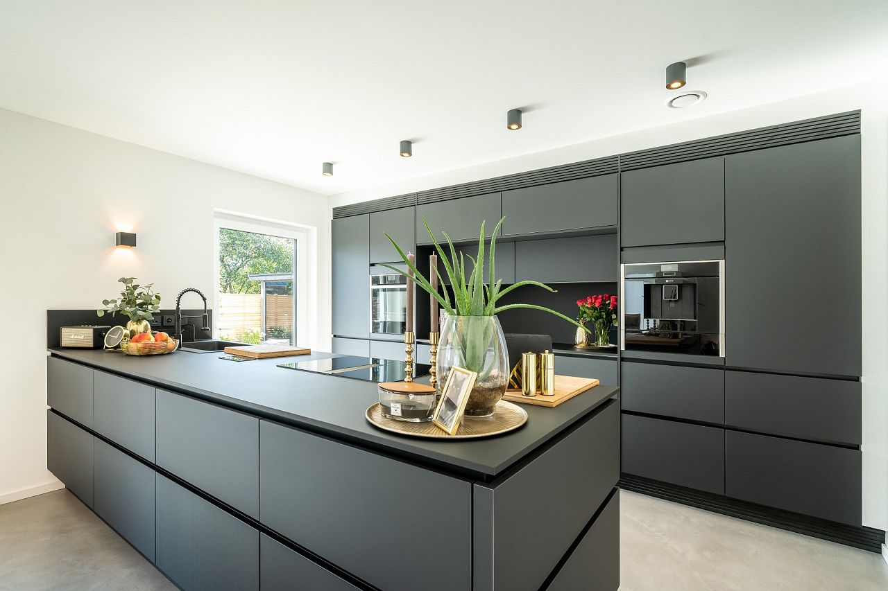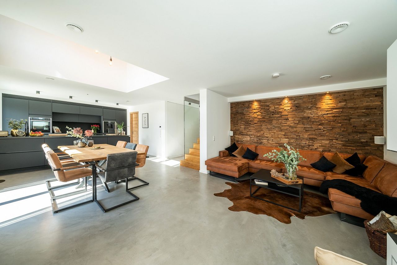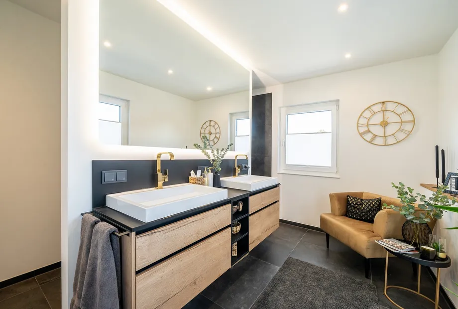 Äußerst geschmackvoll und mit viel Gefühl für die Details haben die Tauchmann-Gericks ihr neues KfW-Energieeffizienzhaus 40 ausgestattet und gestaltet. Natürliche Materialien, wie Holz, Leder und Felle setzen Kontrapunkte zum Fußboden in Betonoptik. Ein eleganter Kaminofen sorgt zusätzlich für Behaglichkeit. Die Küche in Schwarz punktet mit einer Kochinsel, einer flächenbündig eingebauten Schrankwand und direktem Zugang zur Terrasse. Stilvolle Accessoires in Gold bringen Wärme ins Küchendesign. Im Mittelpunkt des Wohn-/Ess- und Kochbereiches steht ein großer Massivholzesstisch mit schwarzen- und cognacfarbenen Lederstühlen. Der Bereich oberhalb des Esstisches ist über beide Geschosse hin offen als Luftraum gestaltet. Stylische Leuchten im Industrial Design perfektionieren die Szene. Der modernen Faltwerktreppe aus Massivholz wurde anstatt eines Geländers, als seitliche Abtrennung zur Diele, eine edle Glasscheibe zur Seite gestellt. Die Bäder sind in den Grundfarben Schwarz und Weiß gehalten. Holz und goldfarbene Ausstattungsdetails bringen Eleganz in die Badgestaltung. Im Gäste-Duschbad wirken die Sanitärobjekte in Schwarz besonders edel. Das Masterbad wartet mit Armaturen in Goldoptik auf.