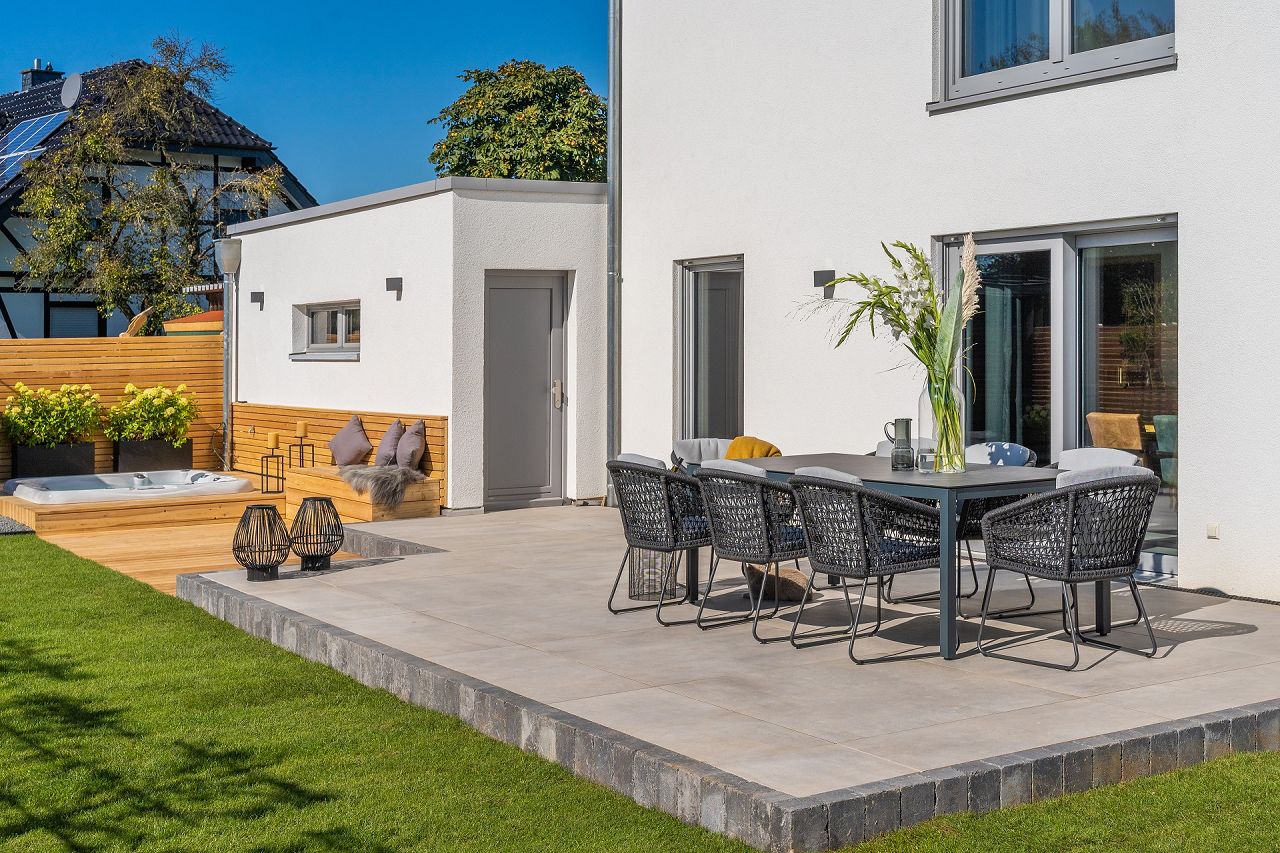 -Garten mit großer Terrasse, Whirlpool/Jacuzzi, Außendusche und Außensauna (Eigenleistung)