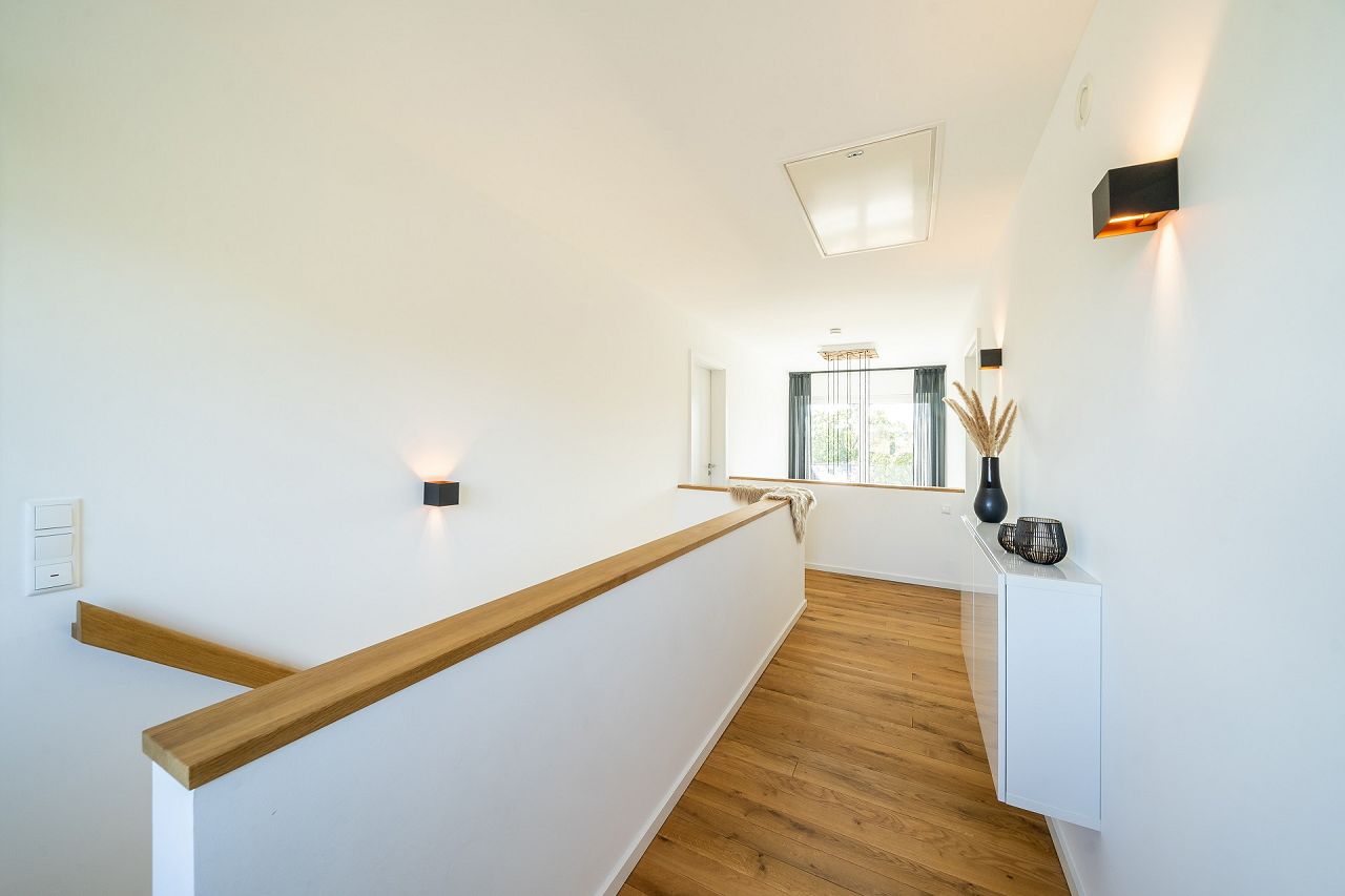 Die Baufamilie hat sich für die innovative und zugleich komfortable STREIF-Luft-Luft-Wärmepumpen-Technologie entschieden. Sie ist ein wahres Multitalent, da sie neben der Heizfunktion auch eine Be- und Entlüftung mit Wärmerückgewinnung und die Warmwasserbereitung in einem Gerät bietet. In der Premiumversion, die hier eingesetzt wurde, ist ebenfalls eine Kühlfunktion integriert. Mit an Bord ist auch eine zentrale passive Feuchtereglung und Frischluftfilter, die die Außenluft von Pollen und Feinstaub befreien. Auch dazu gehört ein farbiges Volltouchdisplay mit integriertem Datenbus für die Steuerung der Anlage im Haus oder auch mobil von unterwegs. Das innovative System funktioniert über die Raumluft. Es werden keine Heizkörper (Ausnahme Badezimmer) benötigt. Die Räume sind frei planbar. Die Leitungen im Haus sind dafür vorbereitet, dass jederzeit eine Photovoltaikanlage installiert werden kann. So könnte z. B. der Strom, der zum Betrieb der Wärmepumpe benötigt wird, selbst erzeugt werden.