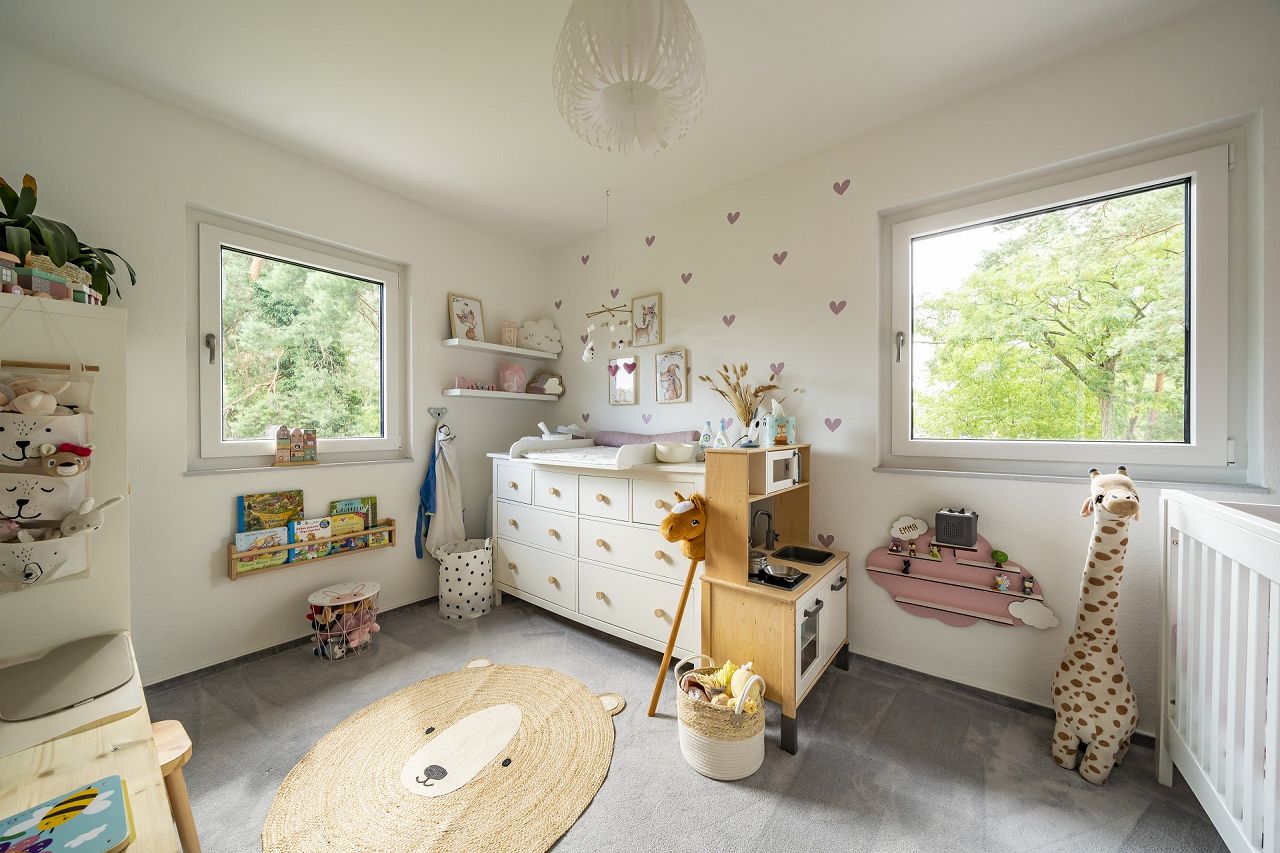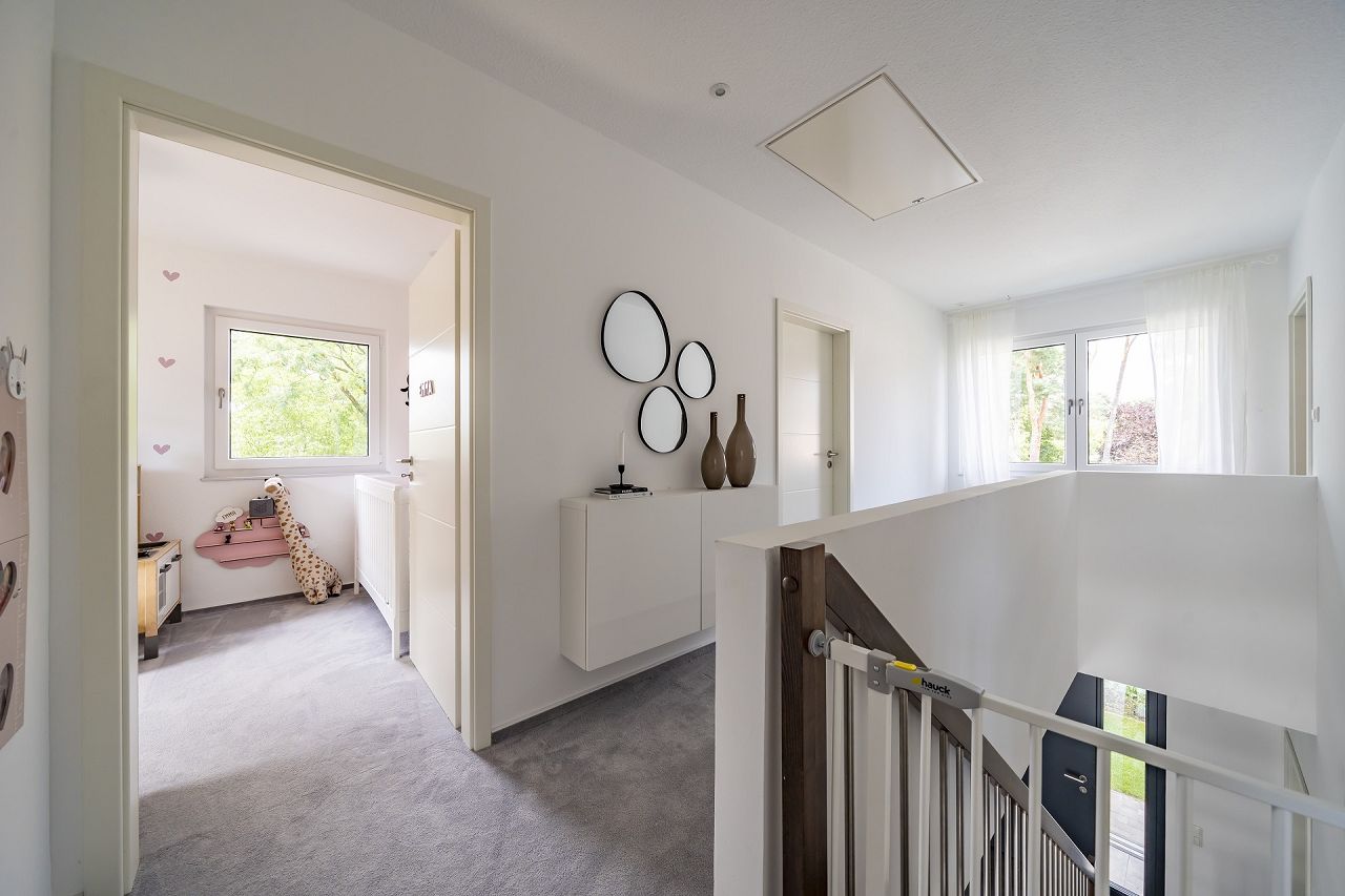 Der quadratische Grundriss der Stadtvilla punktet mit einer kompakten Planung. Es sind Wohlfühlräume in einer optimalen Größe entstanden, die die Bedürfnisse der Familie exakt erfüllen. Auf knapp 40 m² ist in einer wohl durchdachten Anordnung der Küchen-/Ess- und Wohnbereich geplant. Die Küche bietet viel Platz, sie ist so geplant, dass Sie vom Flur- oder vom Wohnbereich nicht direkt einsehbar ist. Das ist praktisch für alle, die gerne und viel Kochen und die Küche als Arbeitsbereich planen. Die bodentiefen Fensterelemente bringen die Natur ins Haus. Im Wohnraum sitzend hat man das Gefühl mit dem Garten und der Natur im Einklang zu sein. Das trägt zum Wohlgefühl enorm bei. Ein Gäste-WC und ein Haustechnik-/Hauswirtschaftsraum komplettieren das Raumangebot im Erdgeschoss. Die geradläufige Treppe ist stylisch und transparent mittig im Haus platziert. Im Obergeschoss befinden sich zwei schöne, exakt gleich große Kinderzimmer, ein Elternschlafbereich mit Ankleide und ein großes Familienbad.