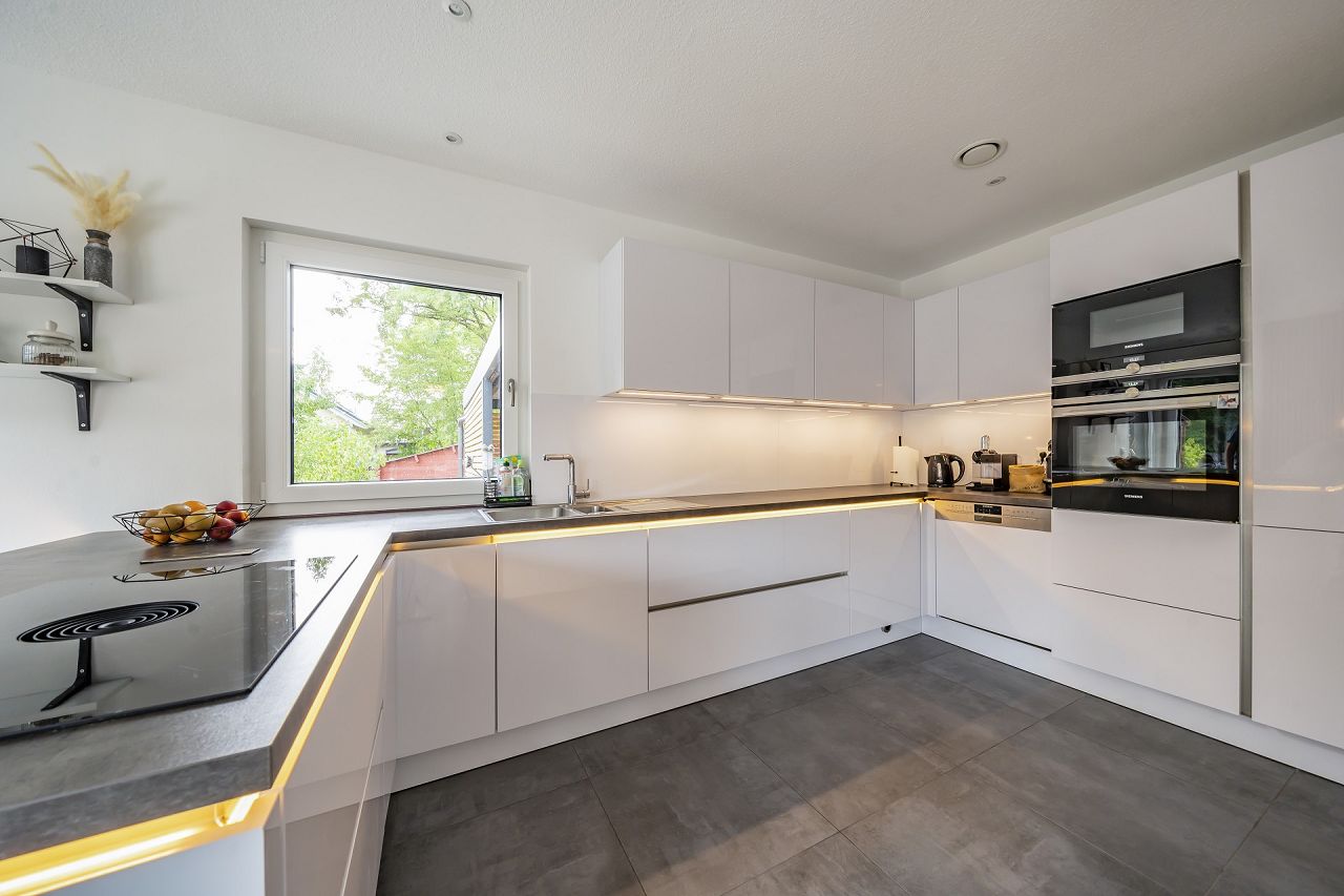 „Eigentlich hatten wir keine wirklich besonderen Wünsche. Zu erwähnen wären hier vielleicht die Raffstores im Erdgeschoss, die uns schon im Musterhaus sehr gut gefallen haben, und unbedingt mit dabei sein mussten. Mir war ein Smart-Home-System wichtig und uns beiden der offene Wohn-/Ess- und Küchenbereich.“
